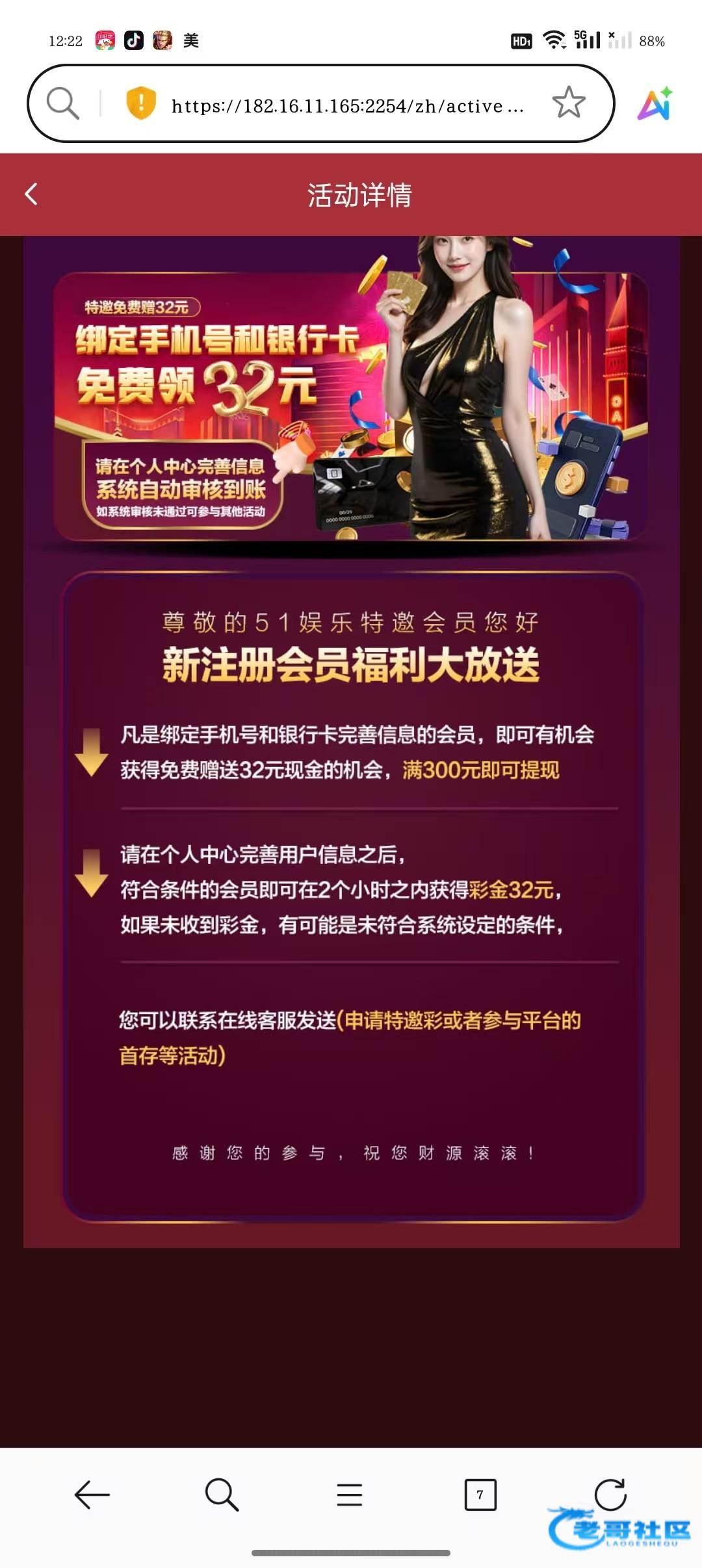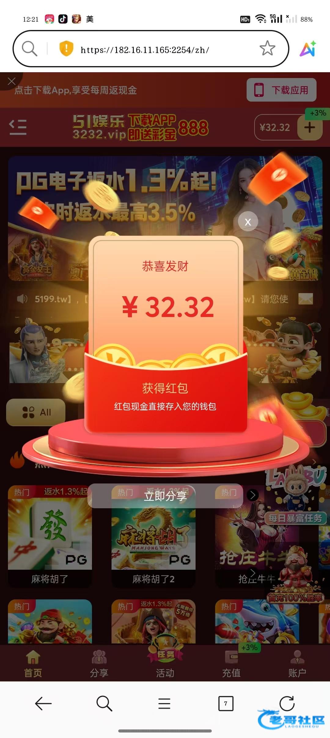 注册成功后,登入进去就秒送32彩金,有没有老哥玩过啊,余额要达到50才能玩。网址3232.vip