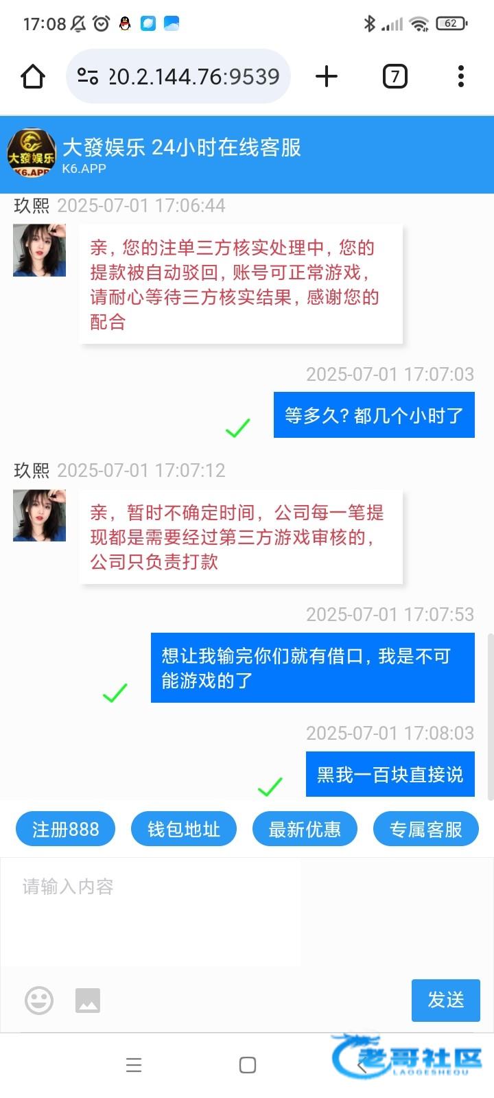 大发娱乐k6.app黑台开始说充值100+68一次性到账,100充了只送28.打pg几百流水提253说差流水我打够提款208又说注单异常要审核都过半天了一直说审核