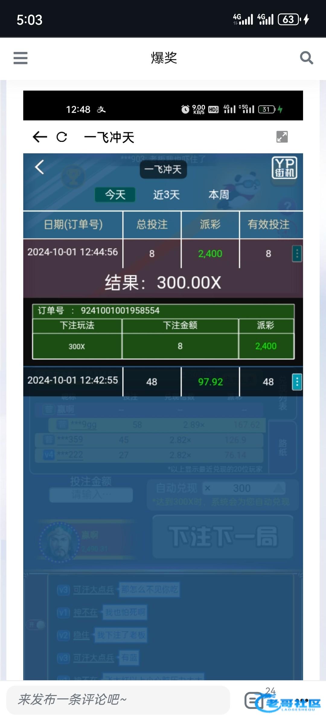 我8块钱飞过300倍 本来45说飞1把2倍90块钱出去打pg 退出去又想飞2把 回来刚好2白色 余额有98 当时就像梭哈飞 但是害怕了 不是起飞