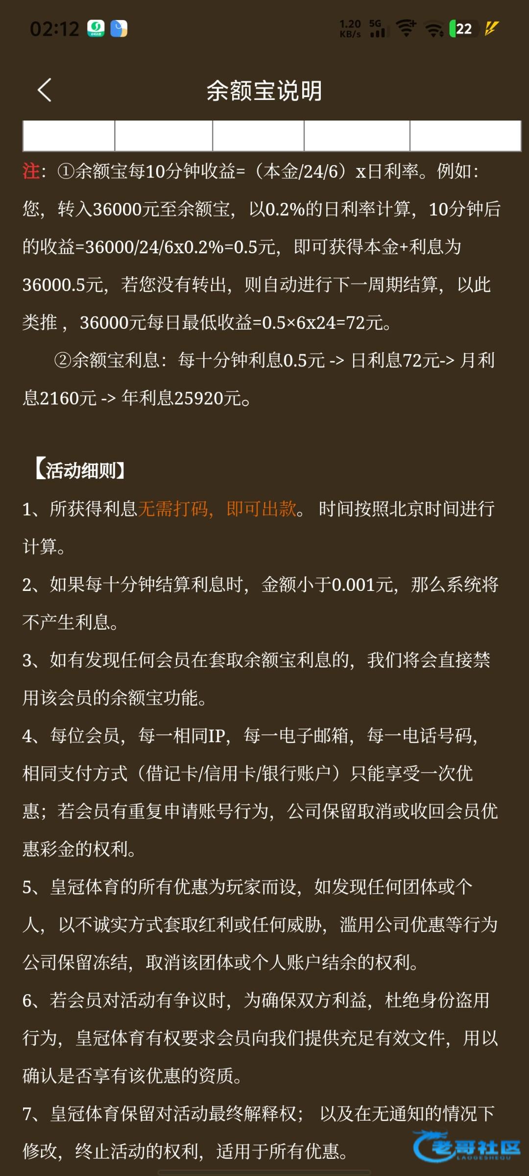 皇冠V7了,这个余额宝从没搞过,平台很稳很久没充了,现在都在撸狗庄,提款除了第一次要手持,后面没任何问题,我想的是我5号发工资,然后充进去刷流水,就留个生活费,这个利息很高,不知道有没有搞头,有没有老哥存过类似的余额宝之类的,有没有搞头,或者说有更猛的推荐一下