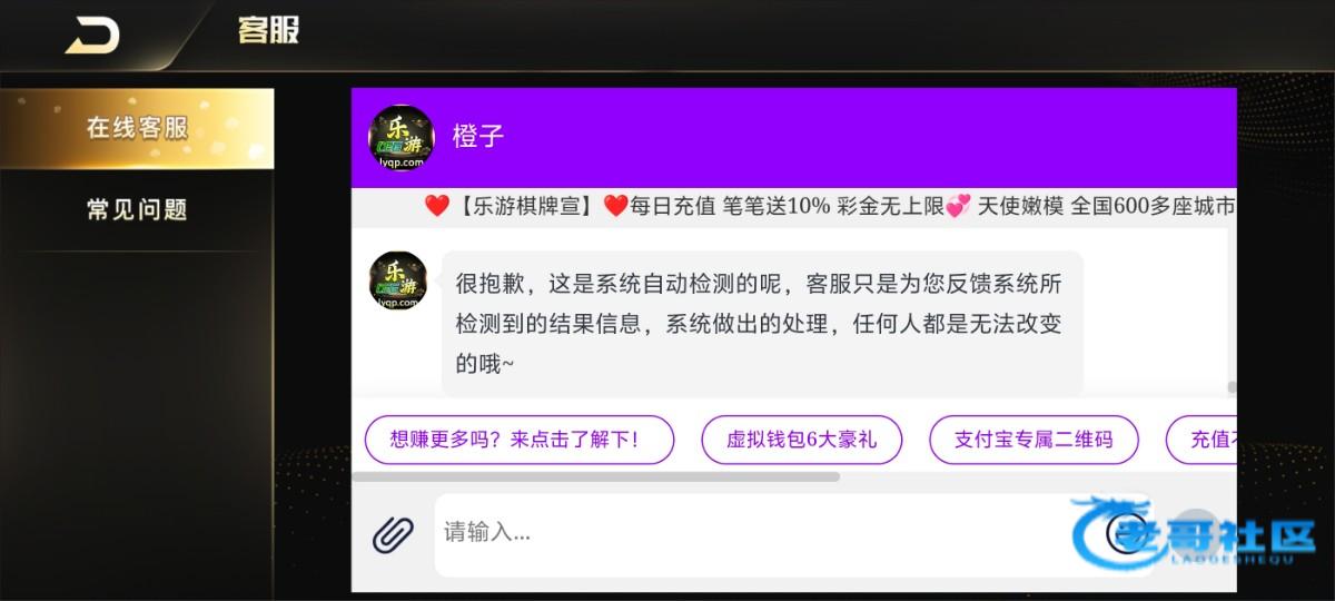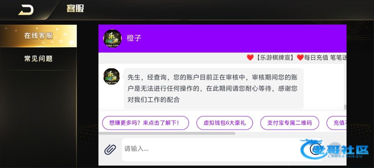 刚刚在乐游26(现改名乐游00)找客服申请回访彩金打到200提现要我充值同等金额,我是乐游4年老玩家累积了好几万且账号是盈利的状态,就毫不忧虑充值了200,输了最后提款201提现退回然后秒被冻结账号,找客服说账号被审核,现在这么困难的我还被黑如今的生活更加雪上加霜,感觉天都塌了,没想到乐游会因为200块黑我一个几年老玩家。