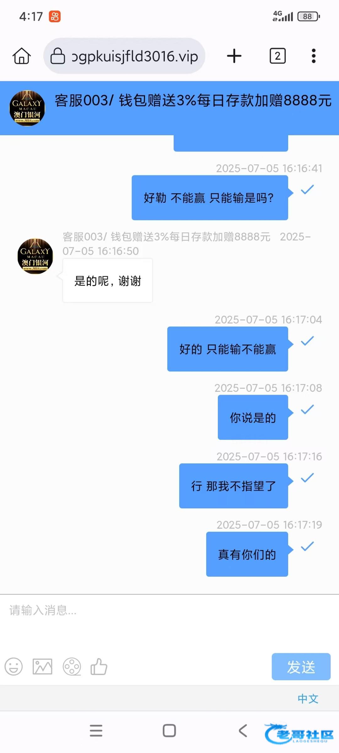 冲了一个进去玩真人 结果挂到3000 心想今天又给狗庄投资了。结果瞎几把点了个电子 爆了2个 然后又去打鱼 打不上去就提现了。提现直接明黑 问客服,客服说只能输不能赢,我真是笑麻了。后面退本给我叫我不要玩电子。然后还剩8000提了。真没格局这b台。