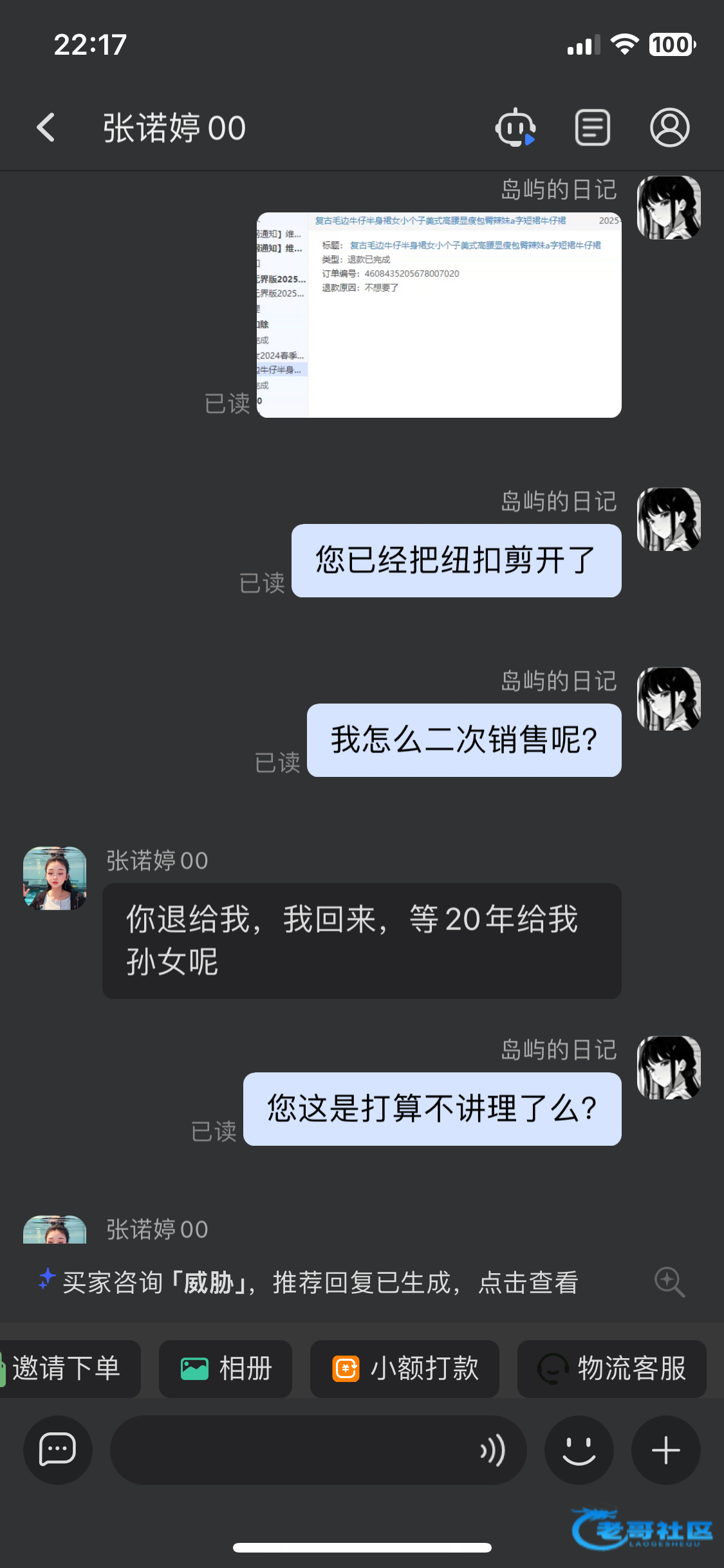这个畜生女的在我店里买了条裤子把眼扣剪开了死活不承认还不把钱退回来给我实在是气死我了