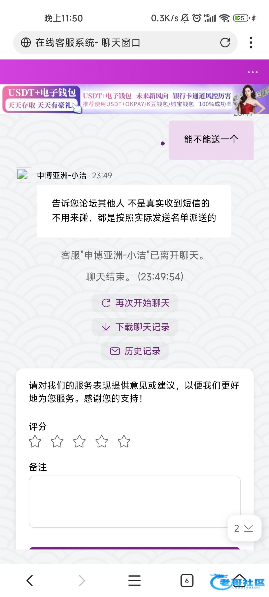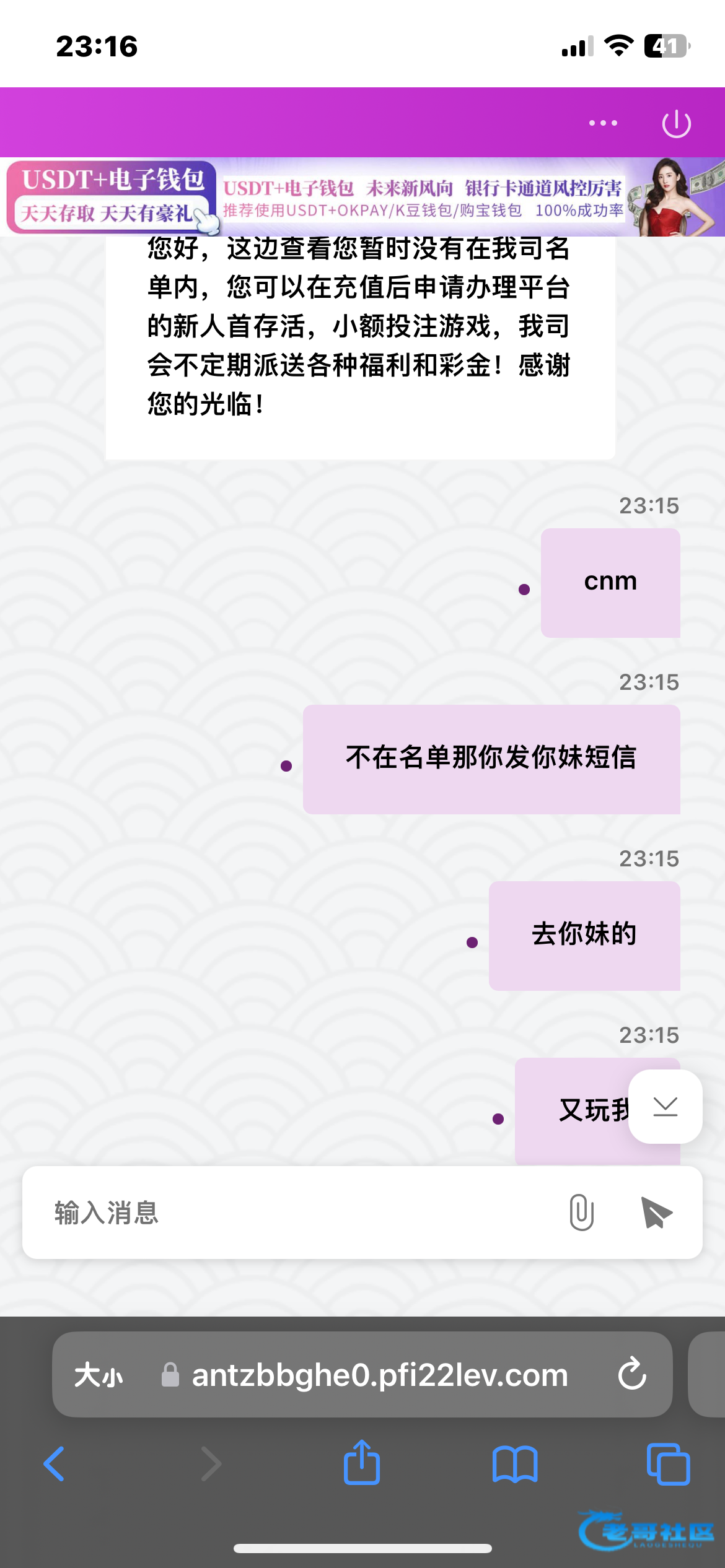 这傻逼台子最早微信加我说找客服领88,去找客服说不在名单,然后又打电话给我让找客服领彩金,又是不在名单,这次我也收到短信了问都懒得去问了