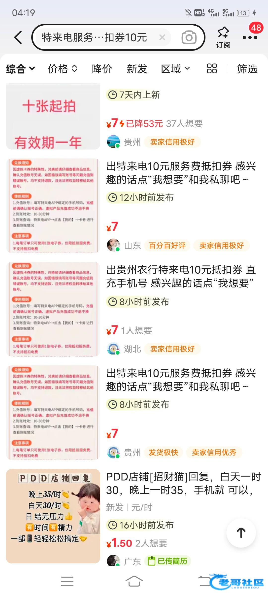 抽完这个奖以后,返回掌银app首页,点击城市专区,切换城市为贵阳,点击全省热门活动,进去以后再点击新能源充电优惠充,1毛钱购买特来电服务费10元代金券,可以自己挂鱼卖(我感觉不太好卖,虽然鱼上面有挂7块的,但往下拉拉还有挂四五块的),也可以在任务平台直接出给悬赏主,价格在4块5左右。这两项加起来能直接到手10块钱左右,饿肚子的可以搞一下