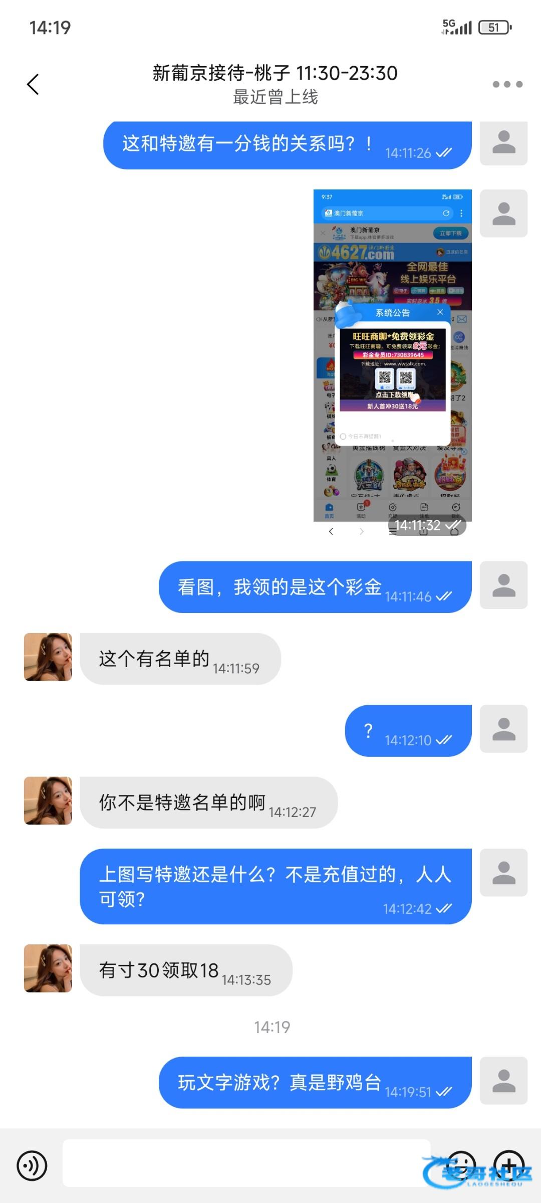真是野鸡台,领个添加聊天软件8彩金,还他妈的不在特邀名额,笑死人,我还充值了