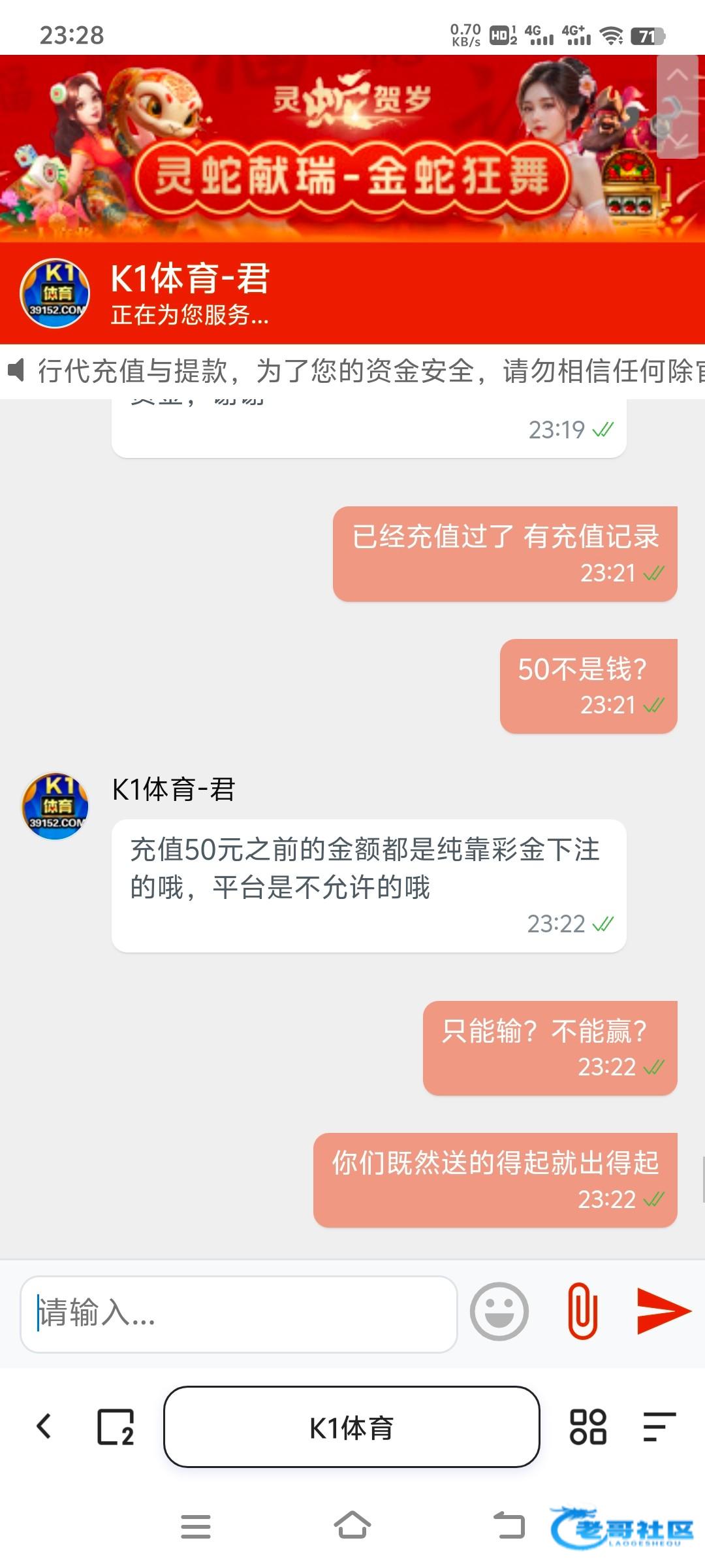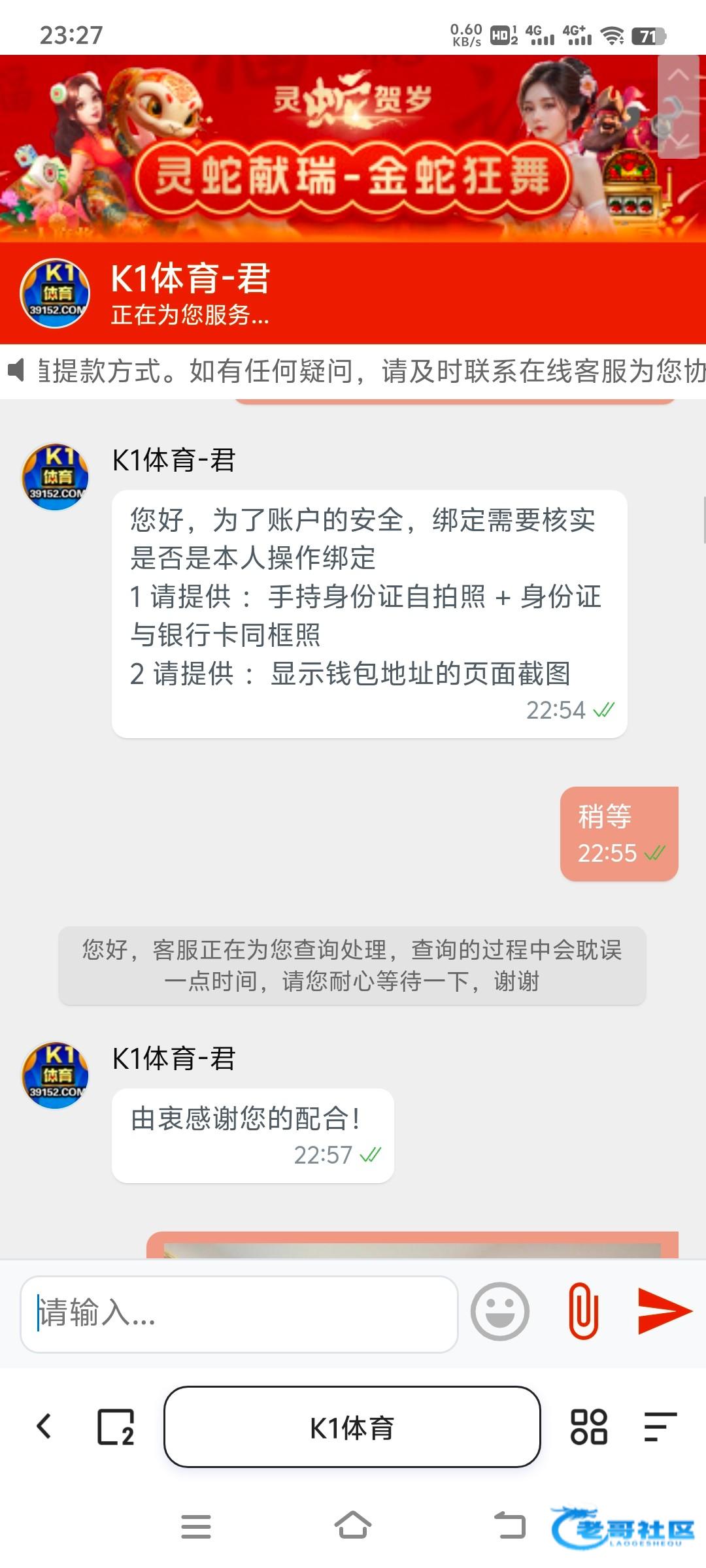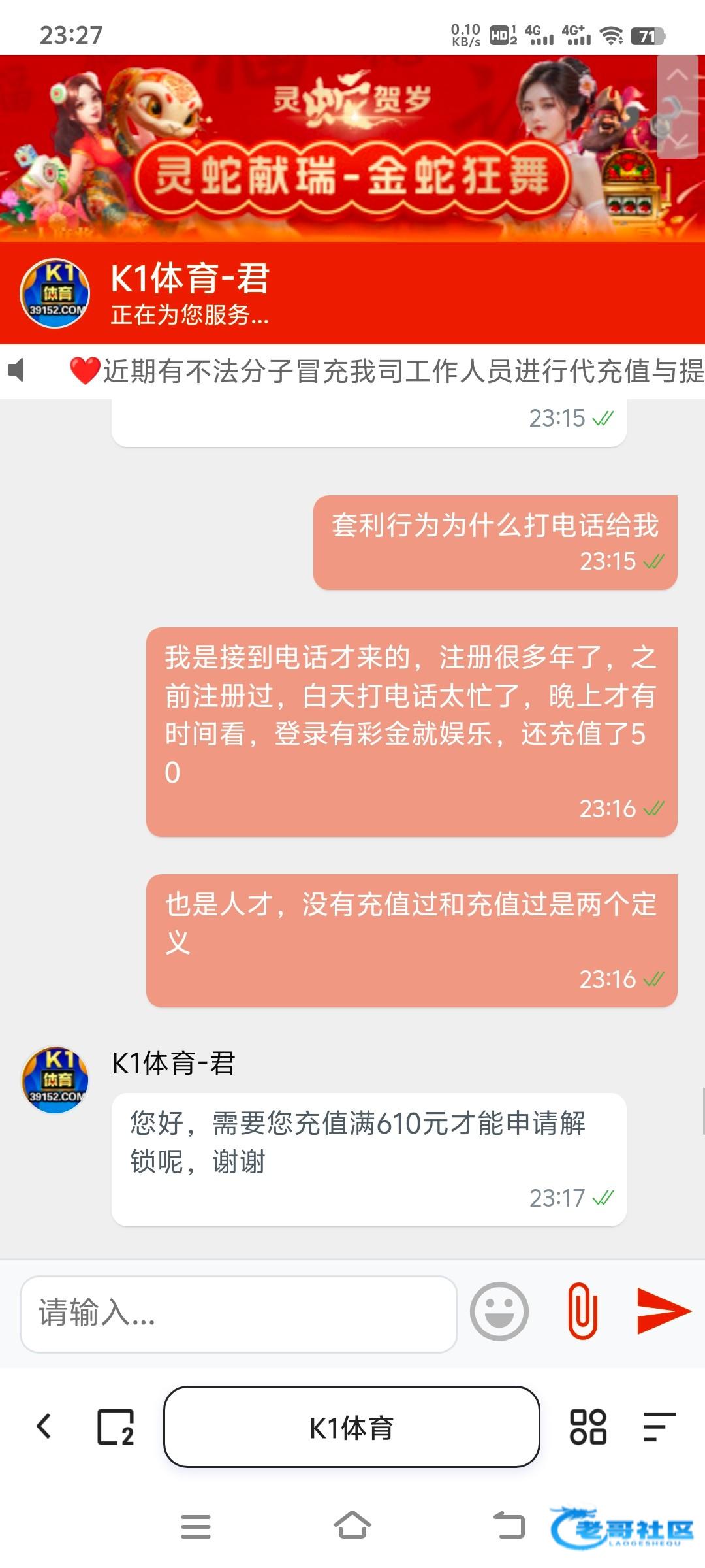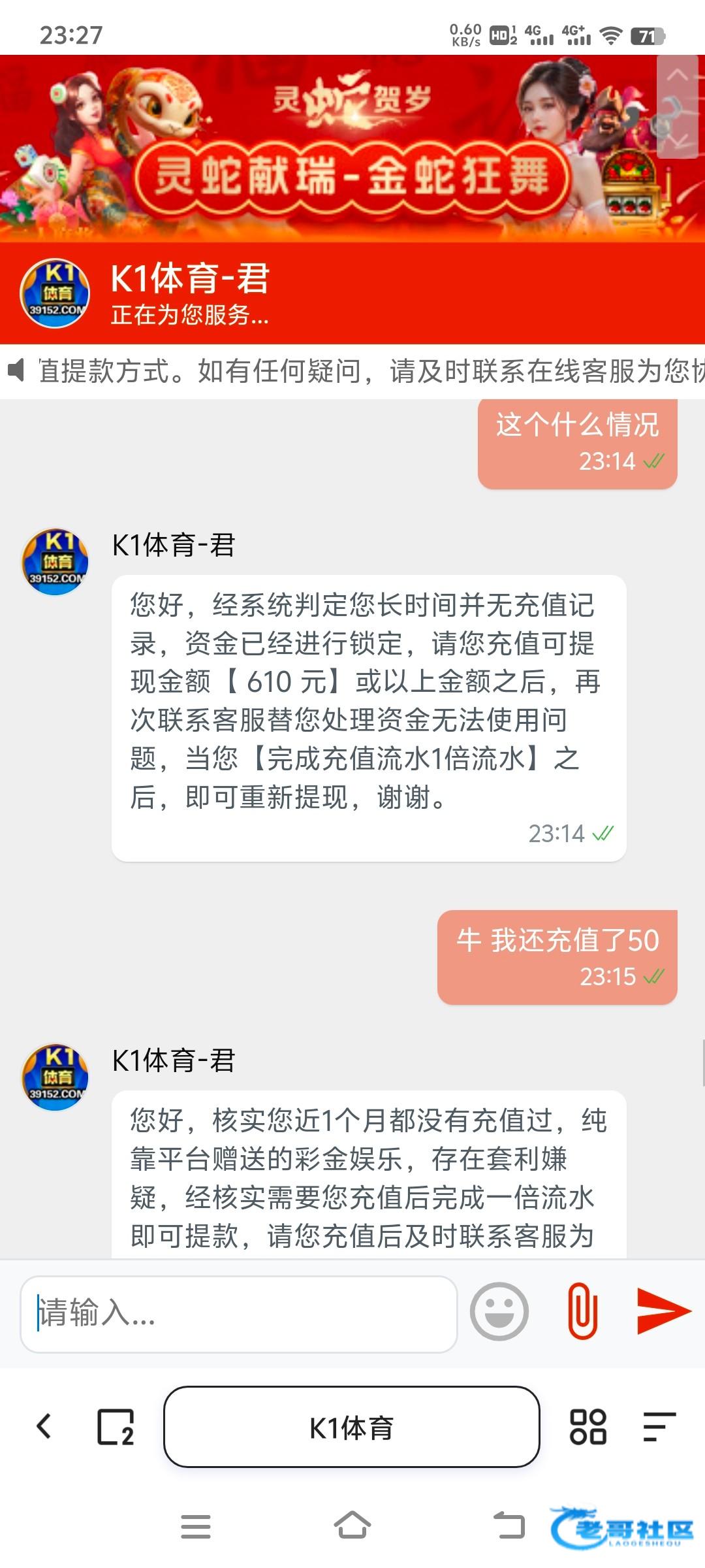 事情是这样的这个平台是22年注册过的!很长时间没有娱乐过了今天看到论坛老哥发帖说有回访彩金登录上线去看有38!然后就用38彩金娱乐大对决打到260!我那会心里清楚直接去提款就会被黑款!我就去钱能反手充值了50进去!然后继续娱乐亡灵打到610了就去提款!先是要手持身份证➕手持银行卡照片!弄好了过后就提款600!看到审核未通过我就知道应该要凉凉了!就去咨询客服果不其然被黑了!这波输了反被狗庄撸了50!避雷黑台k1体育!