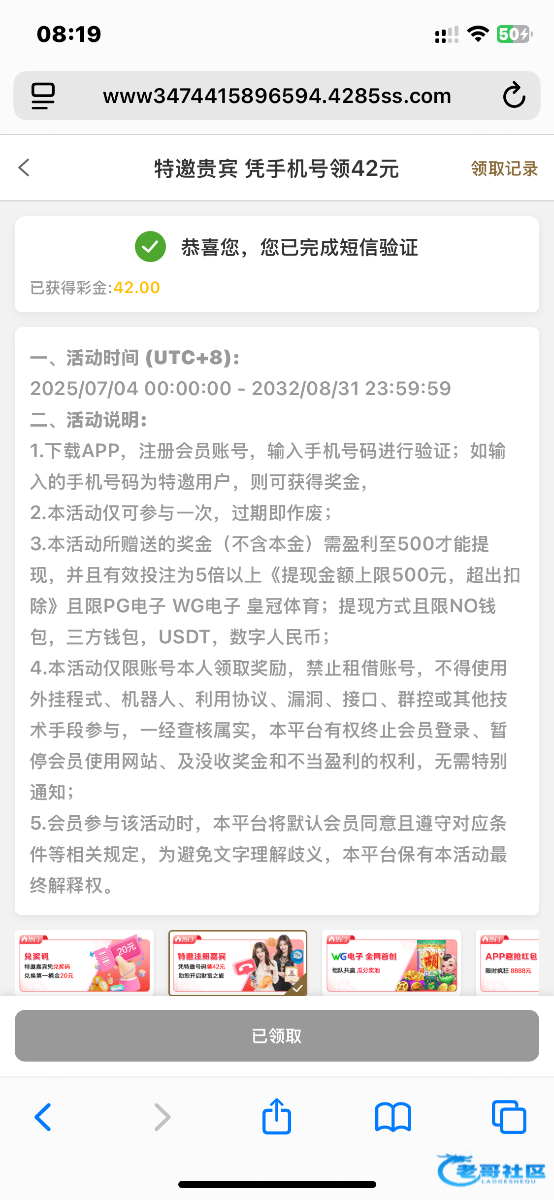 首先不管任何平台使用账号注册,注册完之后直接去活动优惠输入手机号验证,是特邀直接可以收到验证码,不是特邀就输入手机号多点几次获取验证码然后返回继续输入手机号获取验证码多搞几次,等1-3天左右你在去百分之七十是特邀了,我用这个方法搞了很多次都成功了,前两天论坛老哥发的4285皇冠集团当时我三个手机号也不是特邀,今天去有两个是特邀了有一个还不是,不敢说百分百成功但是不去尝试肯定轮不到你發财,不知道發论坛会不会被狗庄修复,都去试试吧!(重点提示:账号注册
