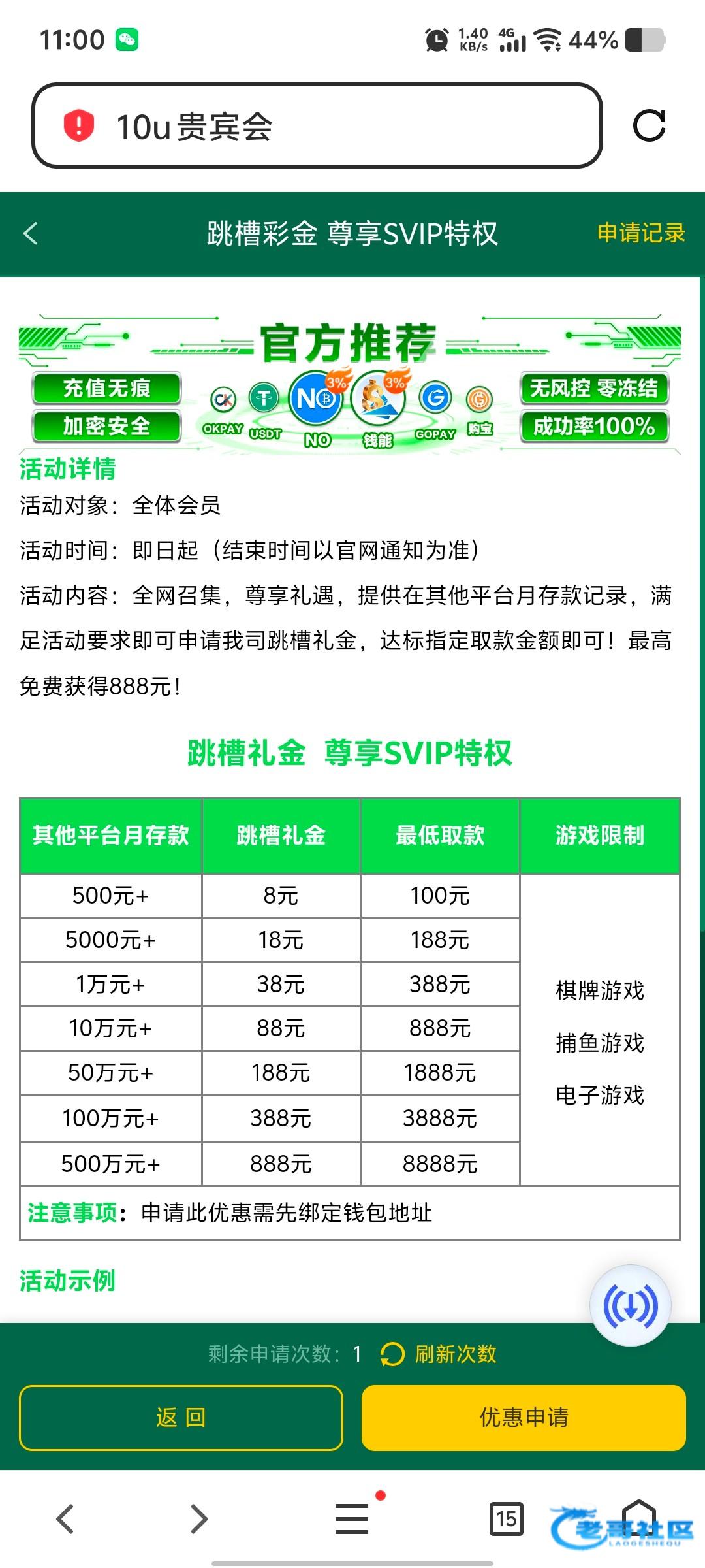 10u贵宾会不用充值可以领取跳槽金,我领取了88,差一点出款,勿充值。链接10U.vip。出款的兄弟团个饭