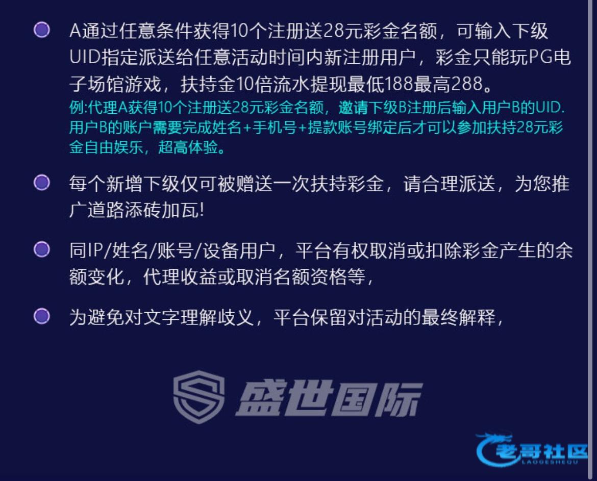 盛世国际 注册绑定手机号 银行卡 留言id  查ip的 送28 限制PG 10倍流水 最低188最高288 不担保出款 禁止充值 充值被黑自己承担后果 先送90个 (评论区有90个就不要在注册了) 撸的人太多了 有时候平台会崩溃 等一会就好了