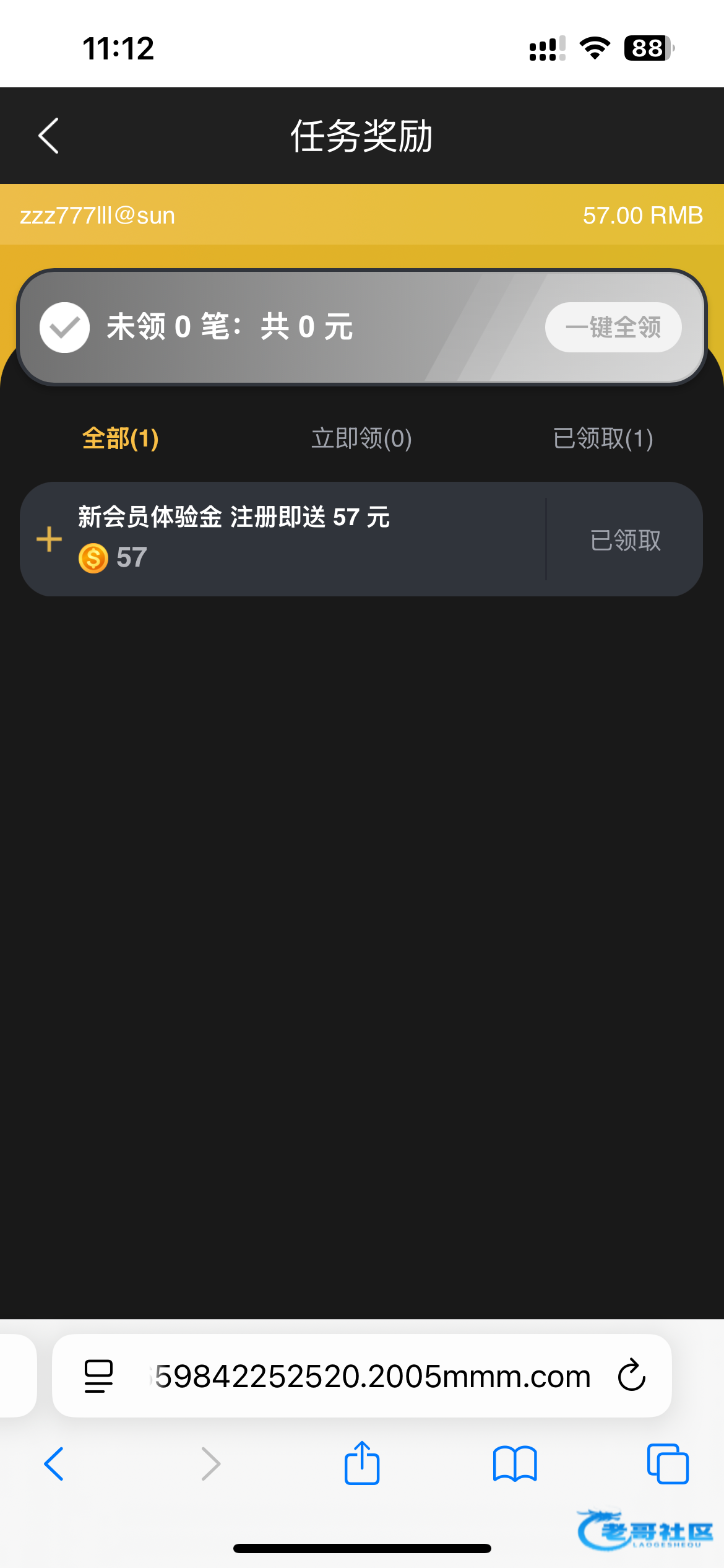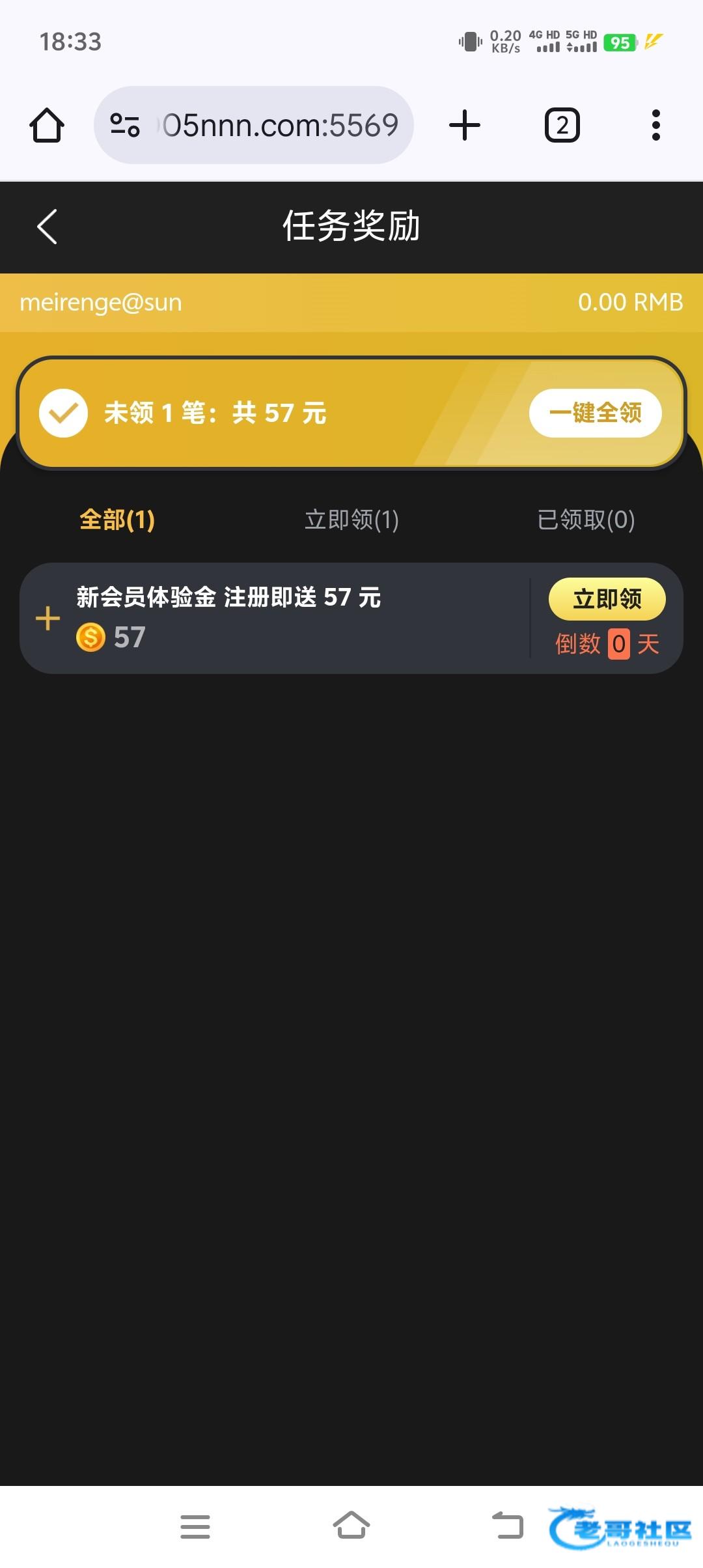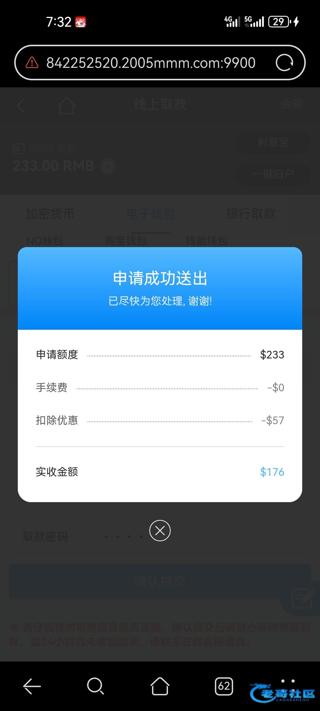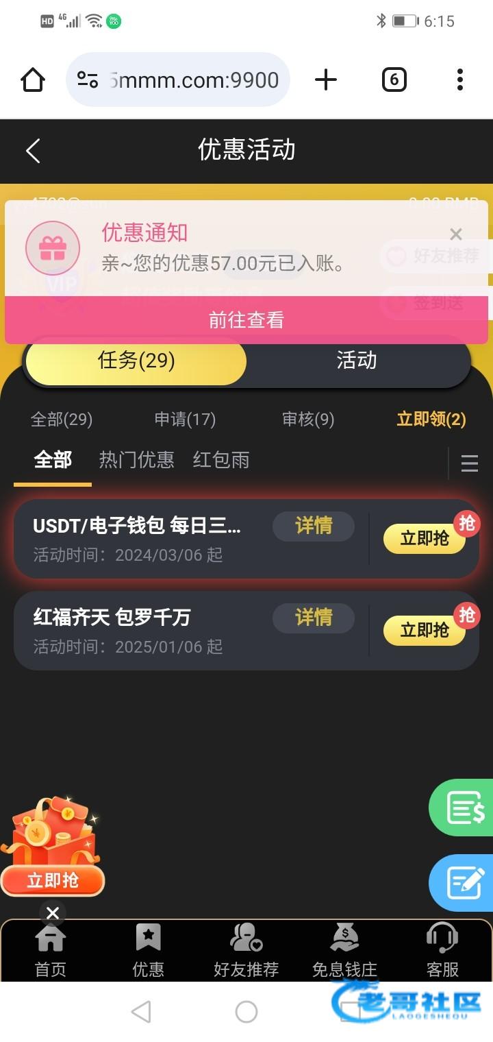 感谢老哥分享,本来就没钱玩了,990抢了1.99申请红包十倍加赠彩金,又晚上注册了这个,中午一登录送了57到了,最高打到290,打够流水剩230提了,秒到,感谢老哥