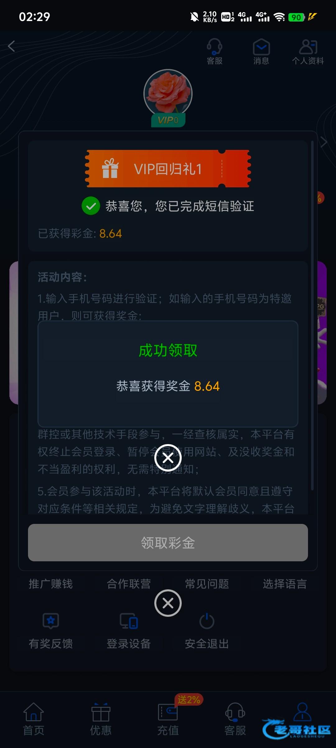 活动是必须下载app登录才能领取!下载登录后点击我的!然后我图1画圈的活动入口点击进入!输入手机号!我领取了8元!有号的老哥都去看一下!不要嫌少!请勿充值