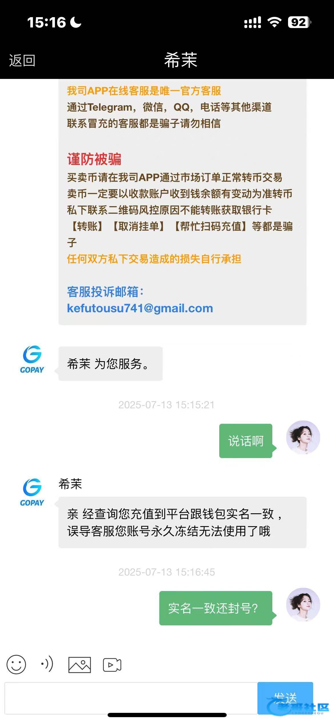 gopqy钱包前两年因为卖币被别人P图了,我说我没有收到钱对方就提交订单,让客服处理,客服一直说等待对方来找客服才行,后面时间到了对方都没有来处理,我就骂了客服,后面把我号封了,原因就是辱骂客服账号永久冻结,还要一个cgpay也是一样骂客服账号冻结