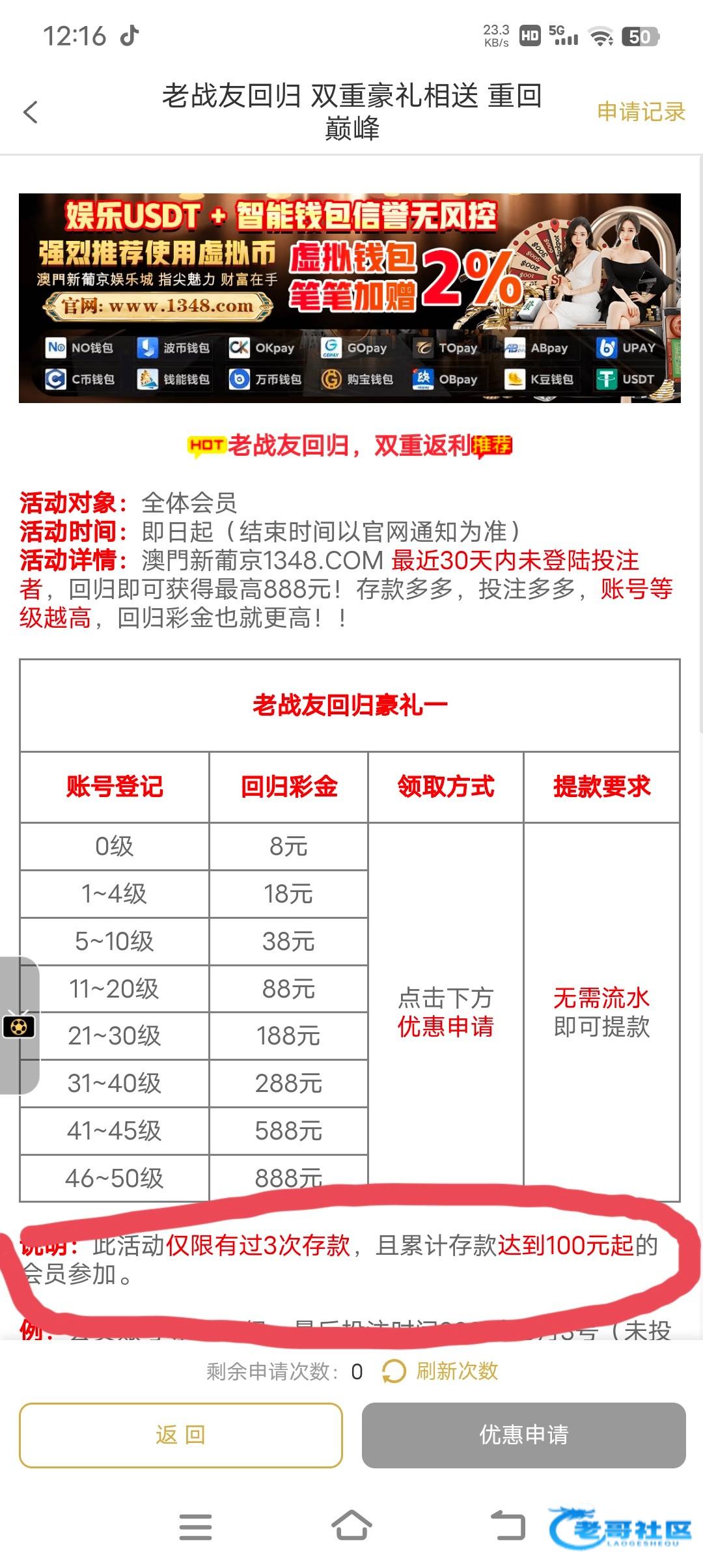 有账号的去热门活动里面老友回归、自己去申请试试,没有VIP也能申请8块 存款三次以上 充值100+ 链接1348.com
