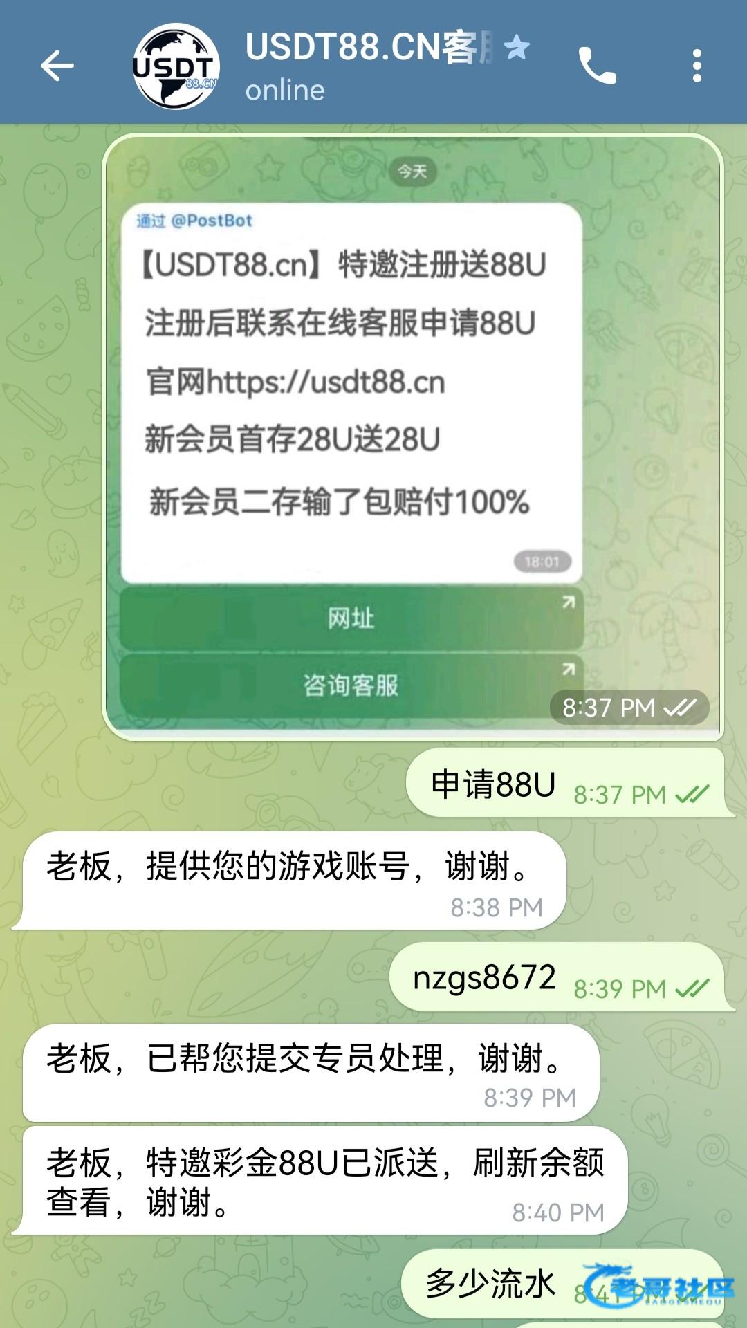 我是收到飞机私信注册给我送了88U,网址 USDT88.cn飞机客服 @usdt88cn