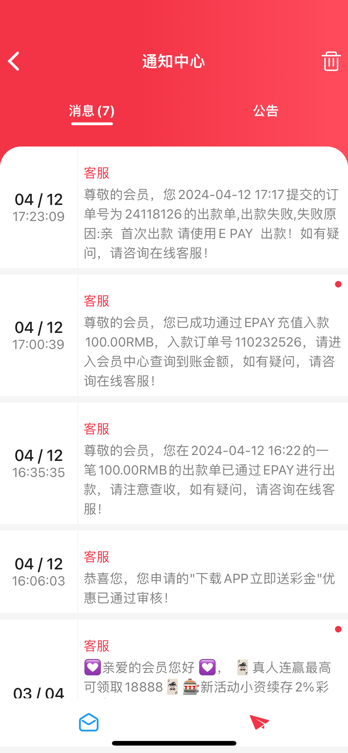 温馨提示;彩金只能提100,到账钱包那里卖币要收%1手续费,那就是99,钱包最低出100的币,99个币卖不了只能上去再打流水,重新上分之后不限制提款。电子钱包首存活动送的那个道具卡可以申请,但是建议不要用,等下了分再用,因为那个道具卡领到的彩金要10倍流水才能下,我是吃过亏的少下了60