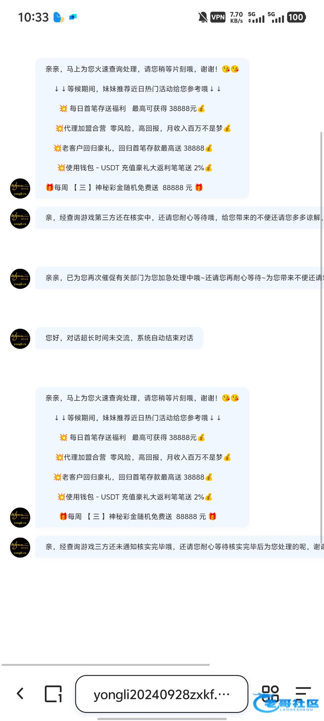 771.cx772.cx773.cxyl0025.comyl0026.com这个台子是黑台来的,我v9的号都能黑,昨天星期三神秘彩金38出了103说我不活跃充值同等,充值了赢到1700一直审核中,说第三方审核注单完毕就能出款,等到今天十一点睡醒还没有到账,问就是审核,玩了好几年了,开始黑人了