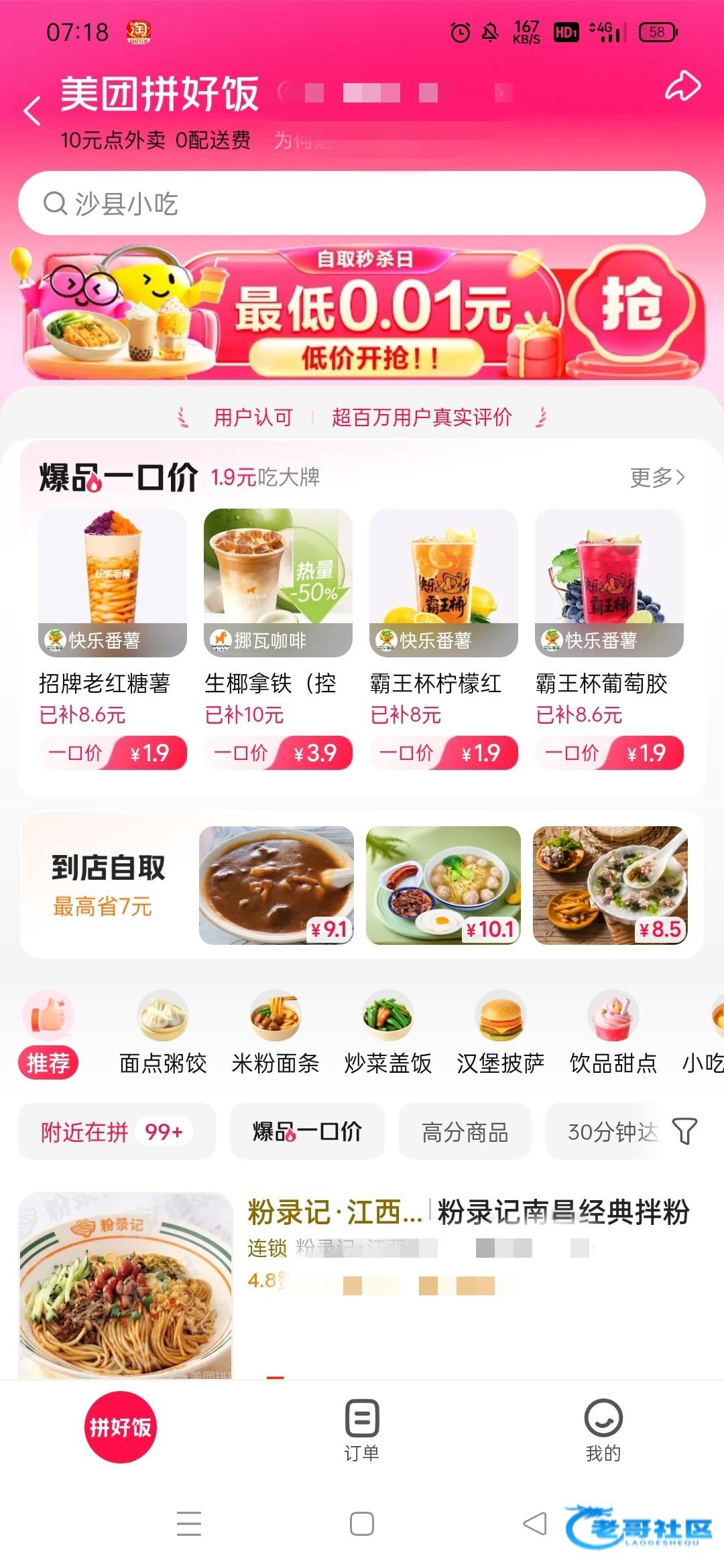 打开美团点拼好饭点上面的横幅自取秒杀日