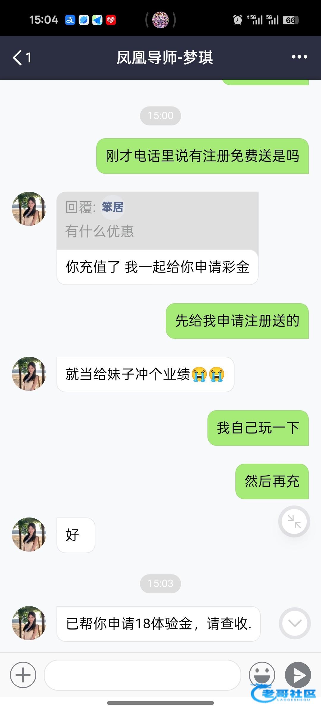 昨晚打给我了 送18懒得要 又叫我充100送188不敢充 全是彩票 打两杯水