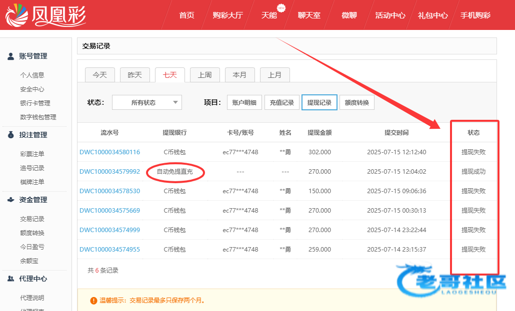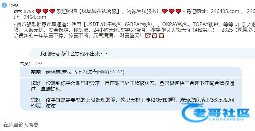 凤凰从昨天开始,很多玩家开始大量被卡款,理由也是各种都有,有IP异常的,有投注异常的,还有的需要充值余额的3倍才能提现的。大家不要上当!被黑的不要再充值了。还在玩的大家抓紧跑。被给这些黑平台送去了!!守护好大家的钱袋子