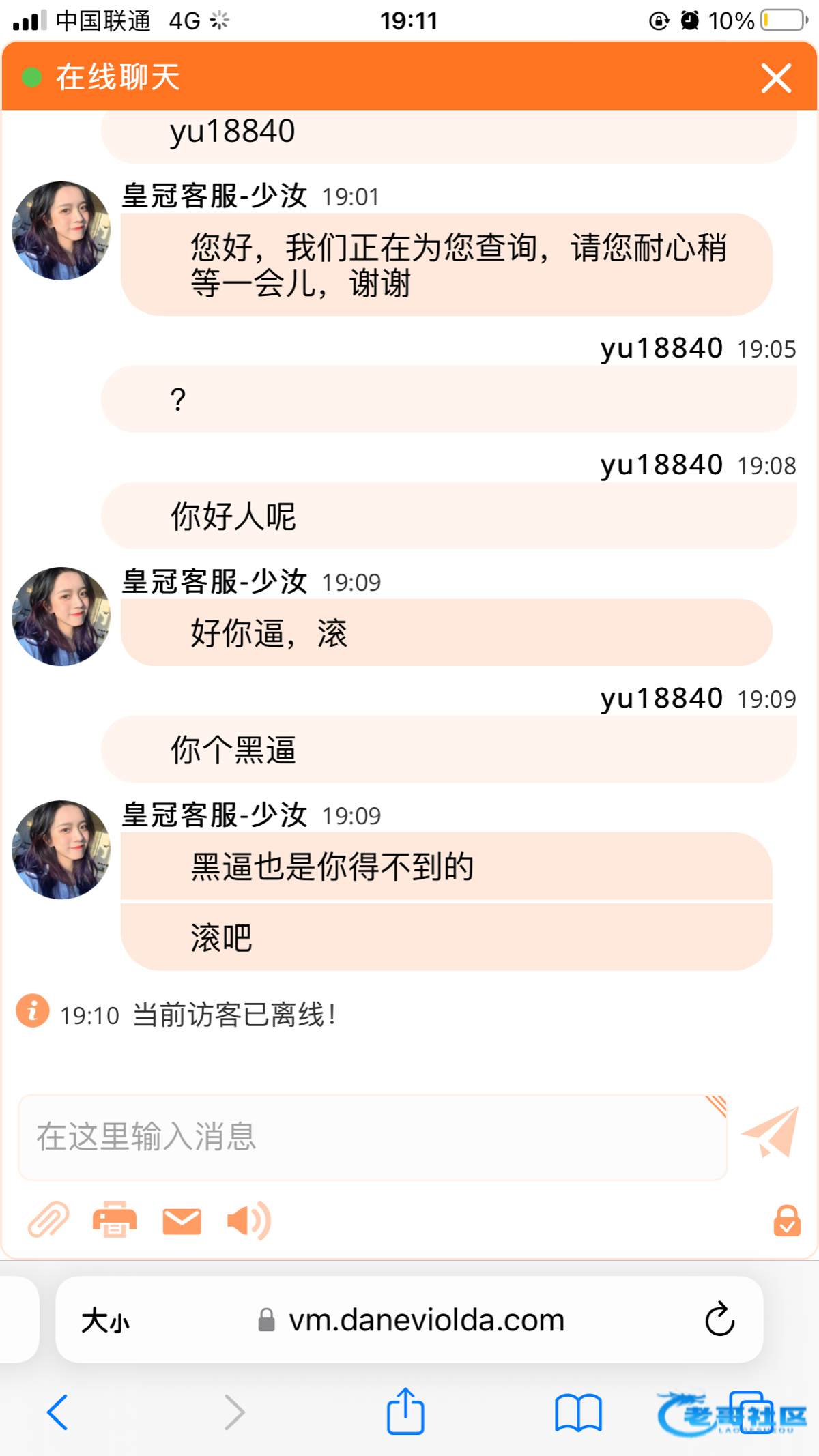 给我一个滚字。我艹他妈。态度恶劣!