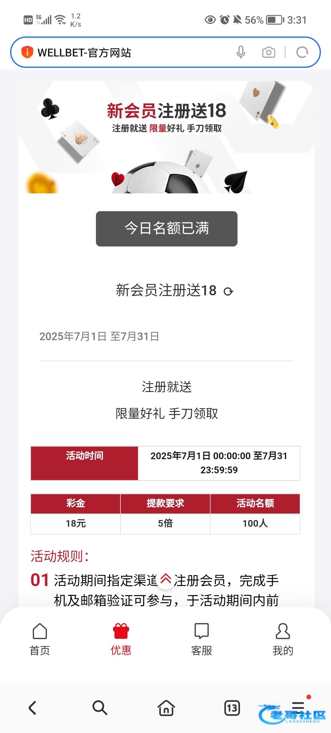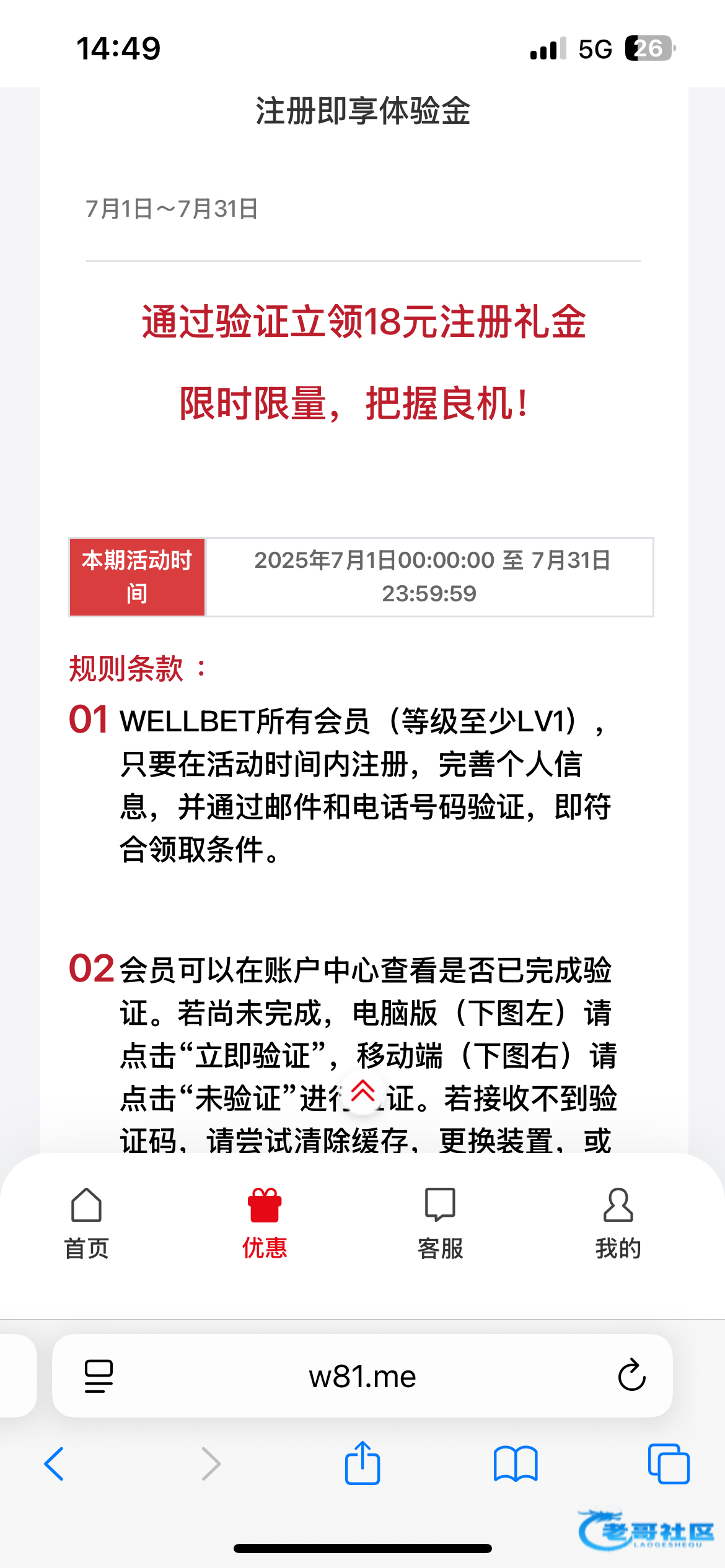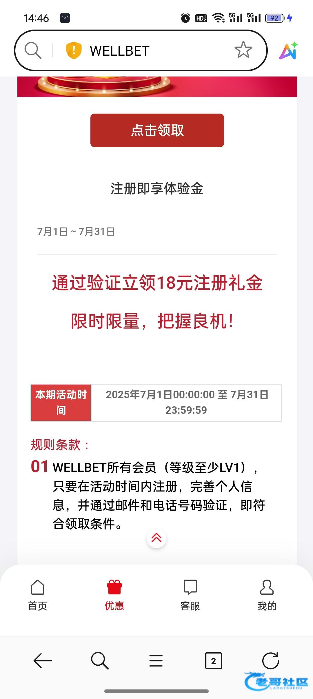 WELLBET所有会员(等级至少LV1),只要在活动时间内注册,完善个人信息,并通过邮件和电话号码验证,即符合领取条件。瞎逼吗,看不见要v1吗
