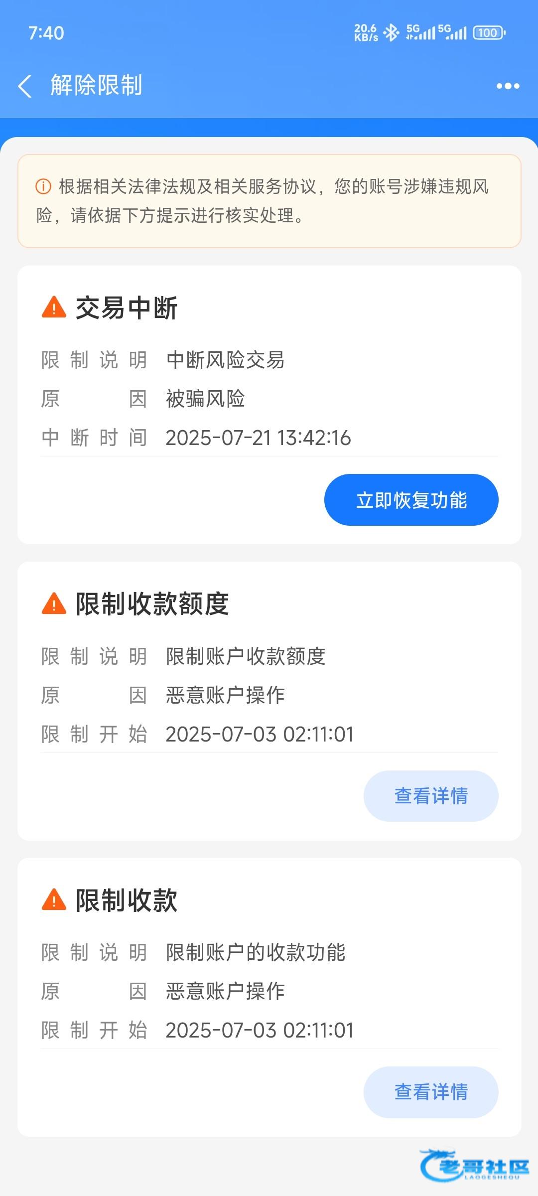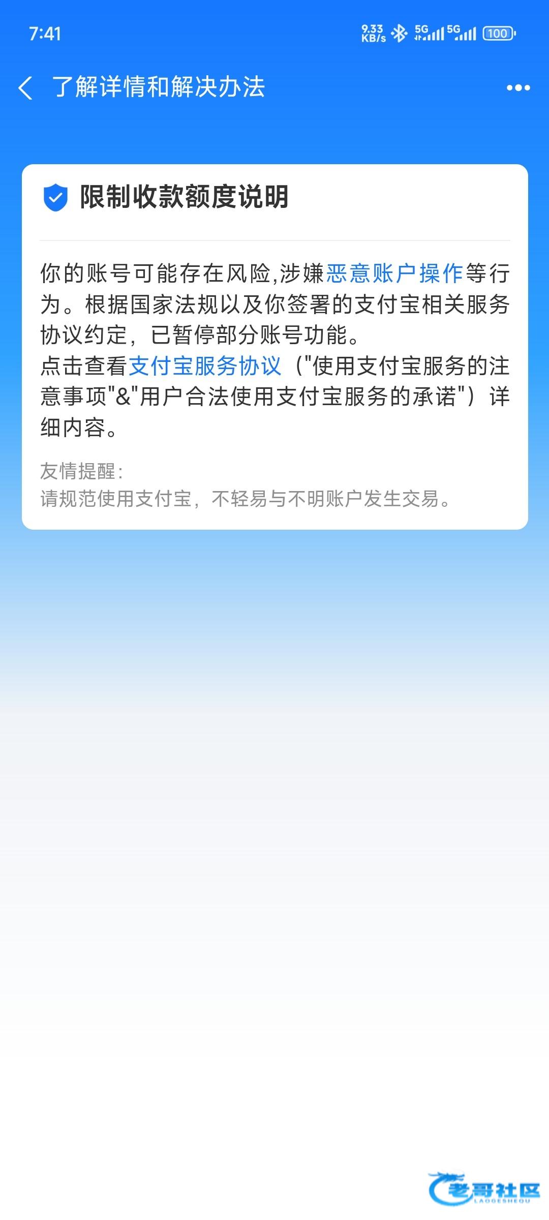 现在收不了钱了,转账也不行,但是支付还是正常的,老哥们有办法解除吗