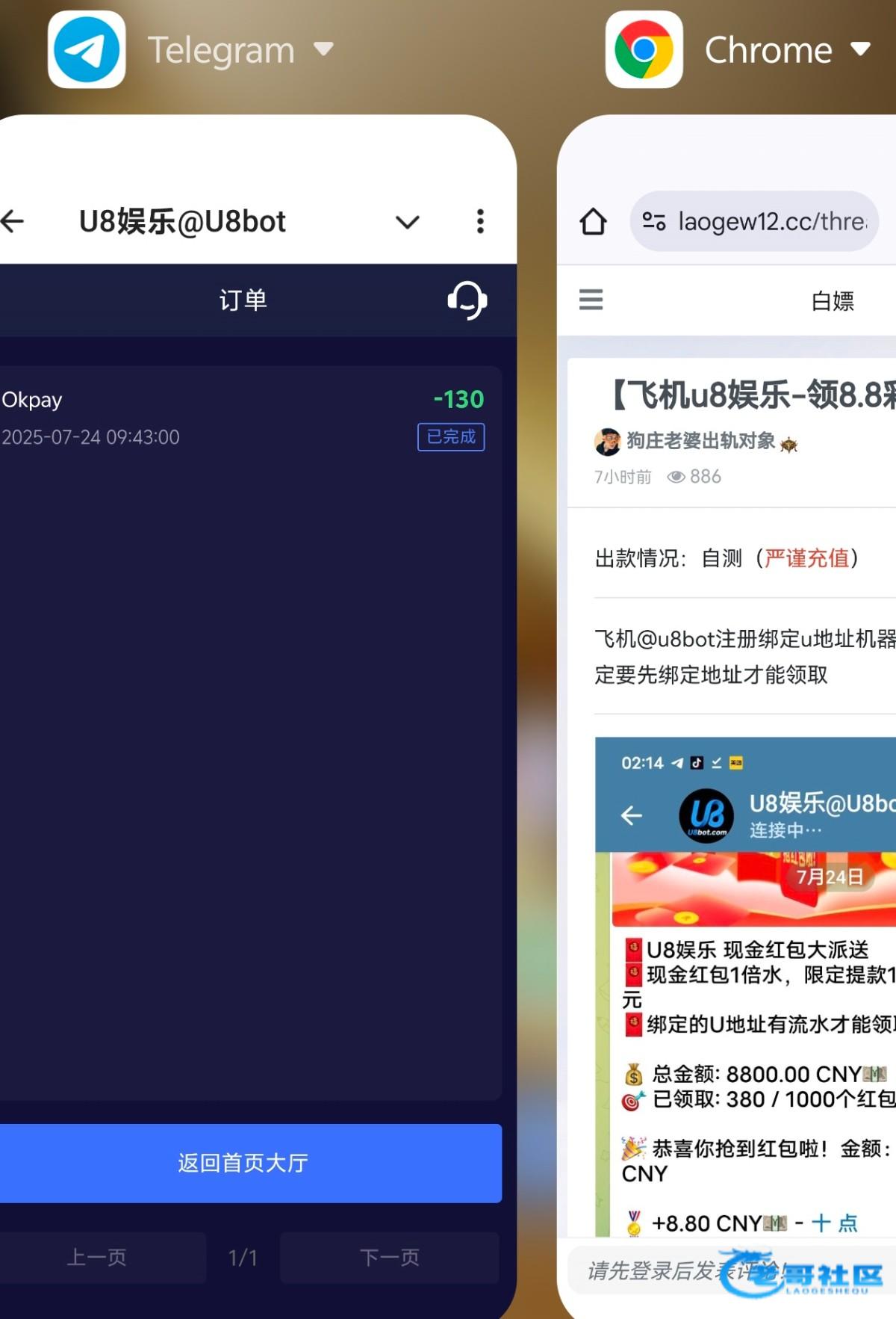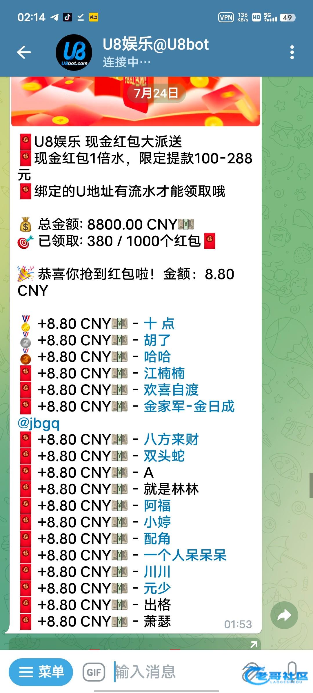 飞机@u8bot注册绑定u地址机器人领红包记得一定要先绑定地址才能领取