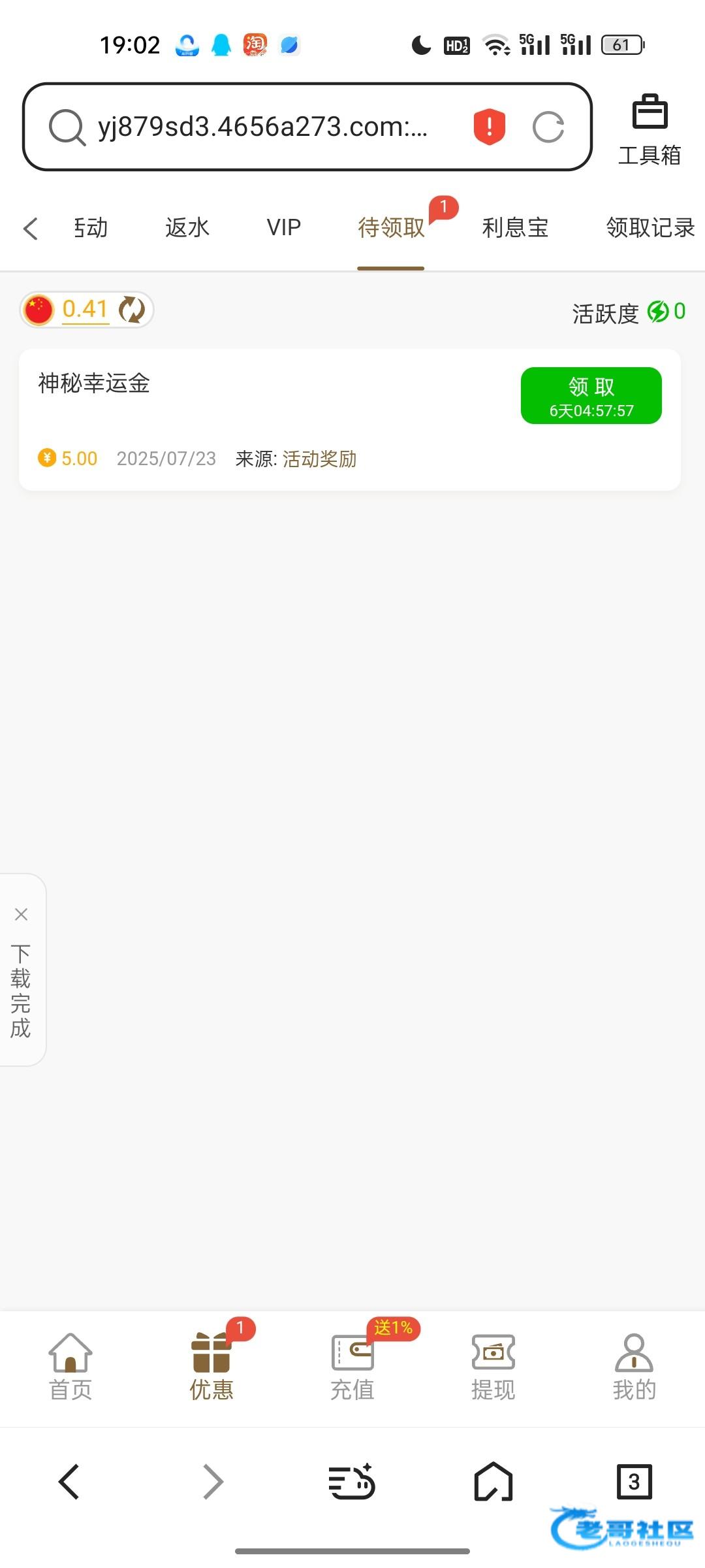 登录有5块,不过,不建议充这个台,充精彩都比它强,不信邪的可以试试,拉1500手都没免费,随机进个游戏,最少要拉3 400手才给免费