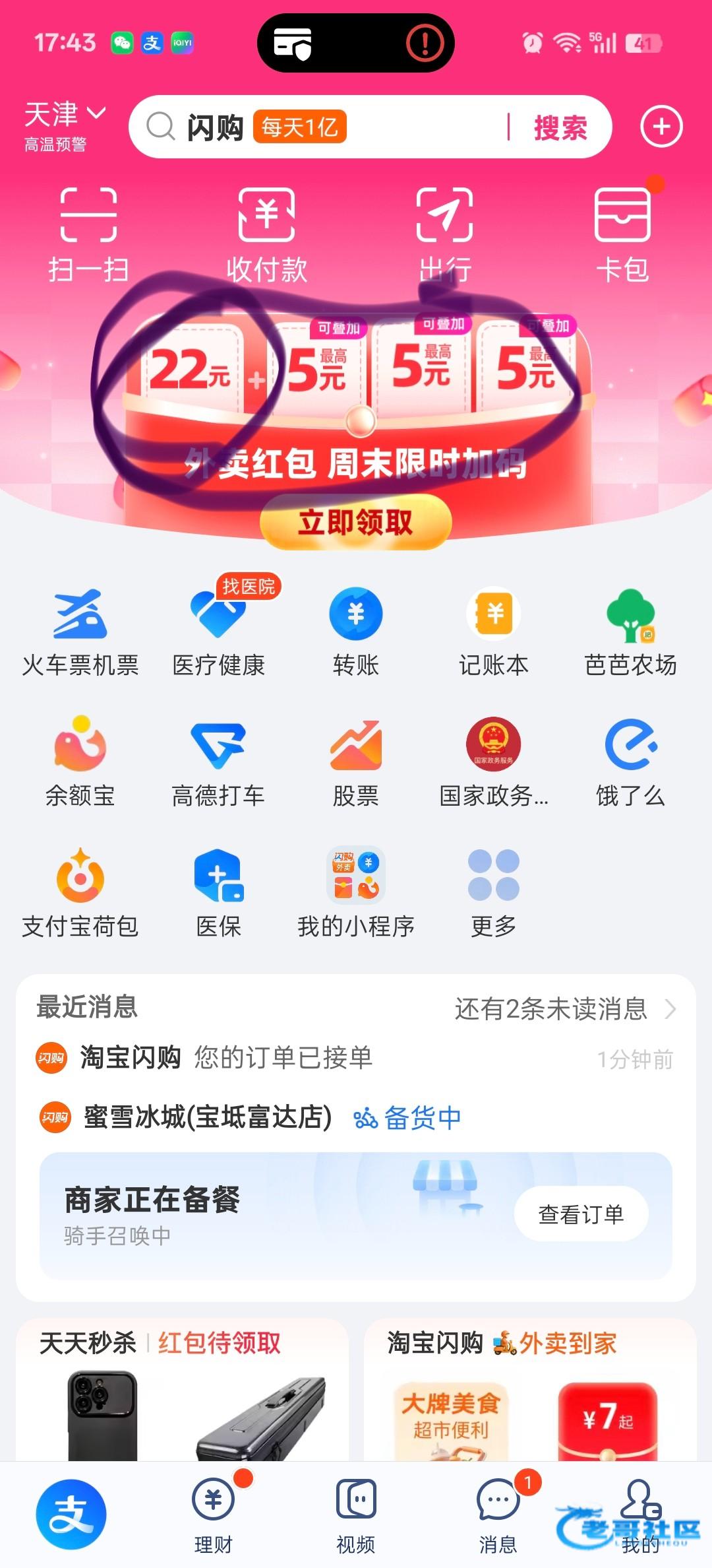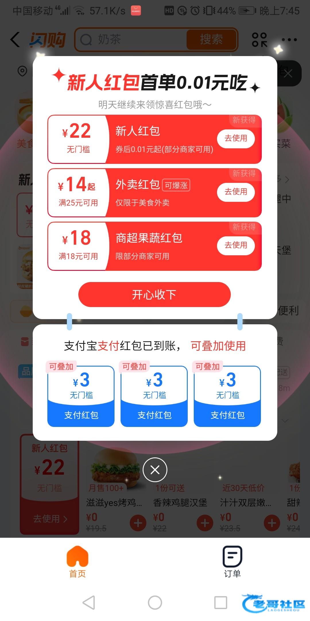 老哥们看看支付宝界面有没有这个外卖红包。有的话可以点外卖,我点了三杯奶茶,0.01元!没有的勿喷!