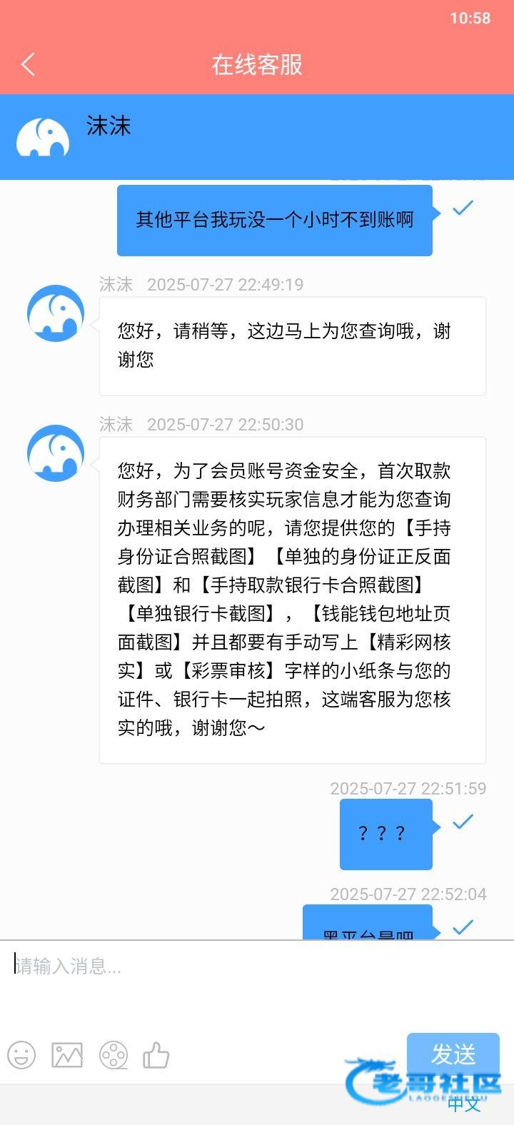 沫2025-07-27 22:50:30您好,为了会员账号资金安全,首次取款财务部门需要核实玩家信息才能为您查询办理相关业务的呢,请您提供您的【手持身份证合照截图】【单独的身份证正反面截图】和【手持取款银行卡合照截图】【单独银行卡截图】,【钱能钱包地址页面截图】并且都要有手动写上【精彩网核实】或【彩票审核】字样的小纸条与您的证件、银行卡一起拍照,这端客服为您核实的哦,谢谢您~