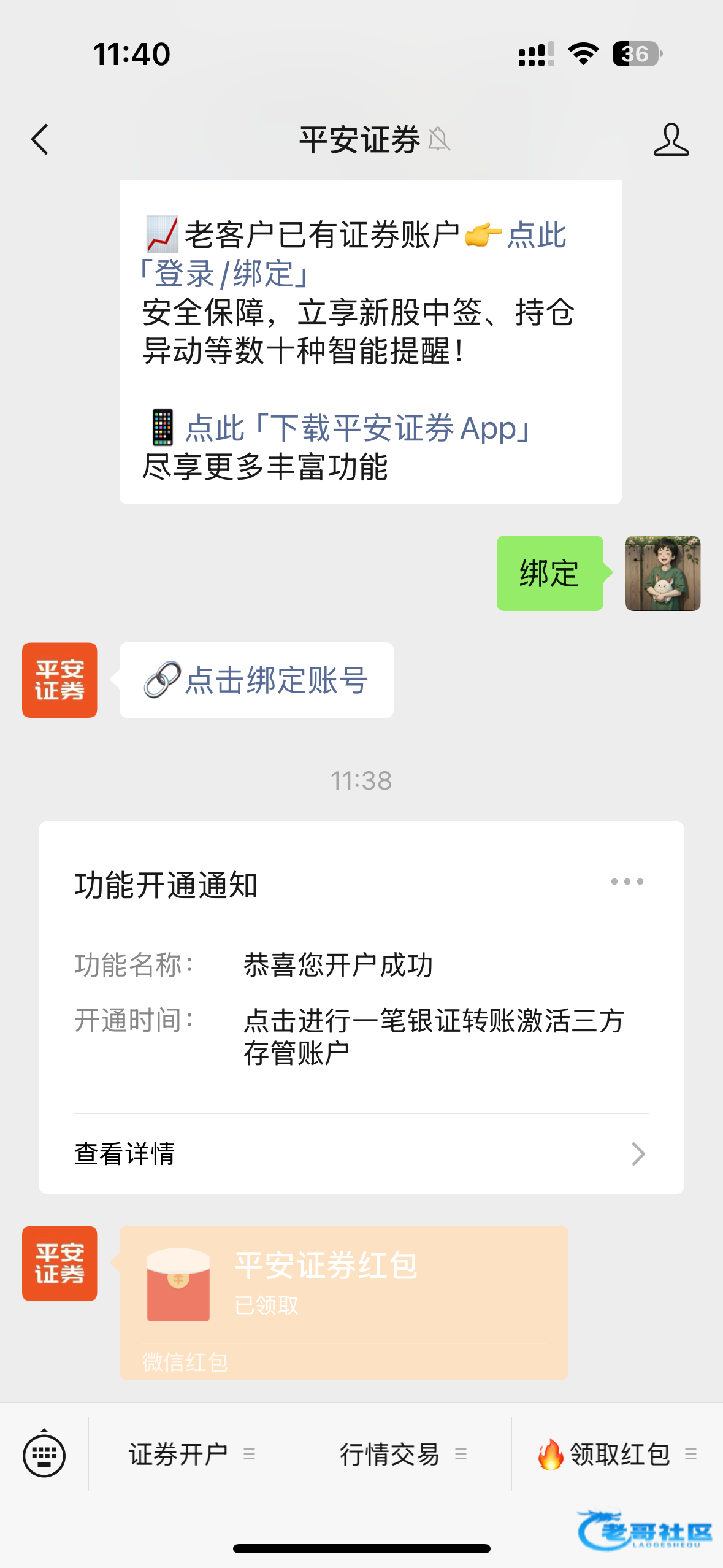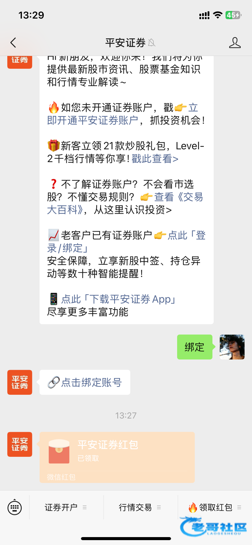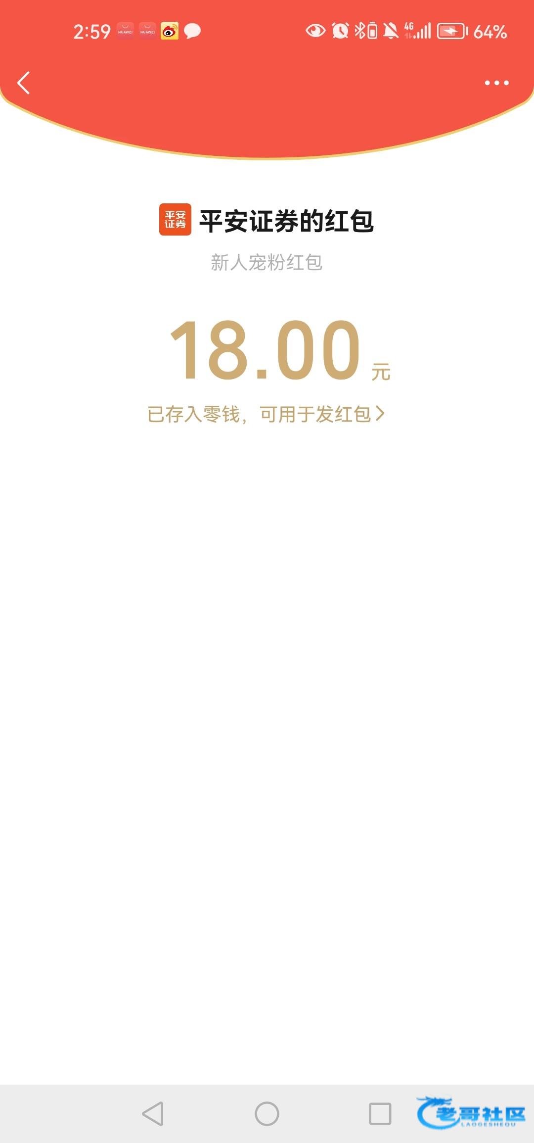 接到电话 重新扫描二维码领取 关注平安证劵公众号绑定账号 然后下载app登陆点我的 拉下去点你的新客福利已到账点进去就可以看到微信红包 点领取就到账微信了