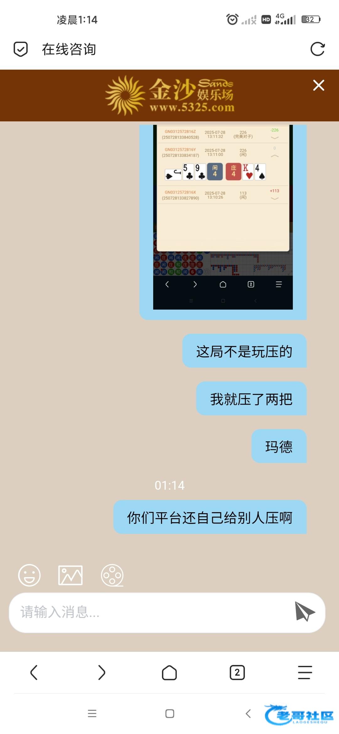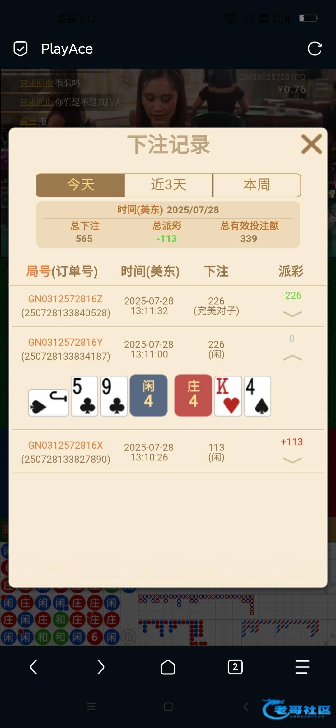 今天玩5325平台,还有113块钱准备去过两关提400走 ,结果我第一把中了,第二把开到4点我就没看,突然就卡了黑屏,我以为闲四点输了 ,我就去看下注记录发现系统给我梭哈了完美对子,真NB,