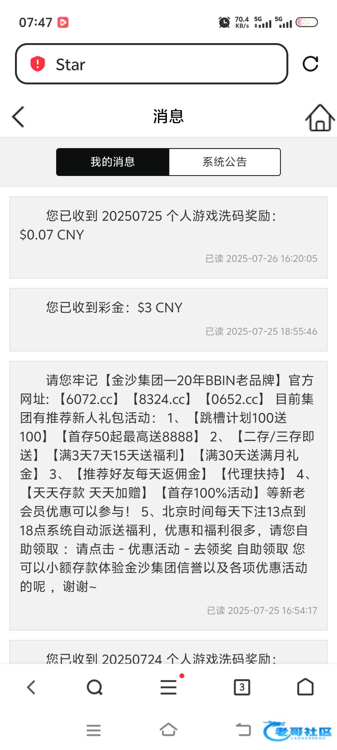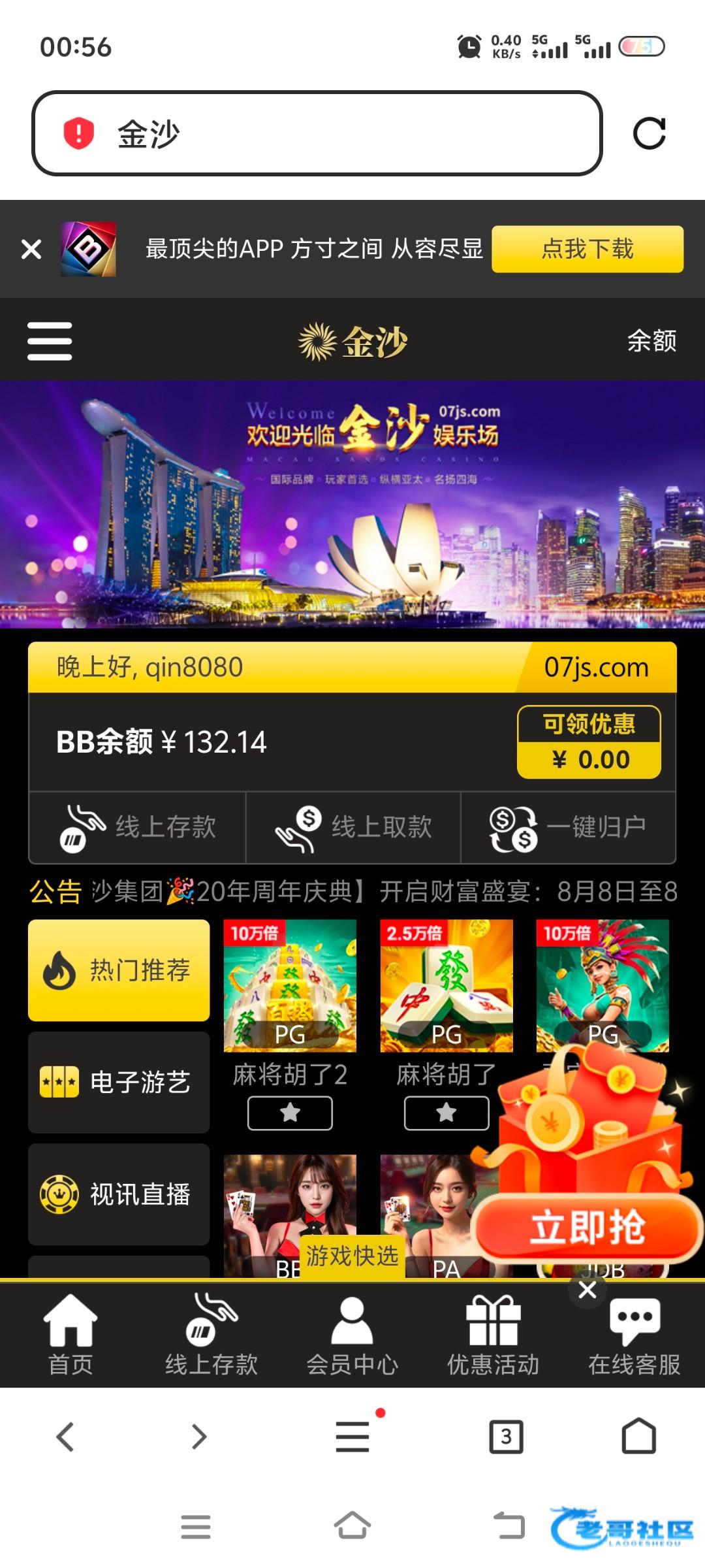 这是之前星际娱乐推荐的那个平台,07js.com 就充值过100,然后刚才随便登录一下,里面有彩金。