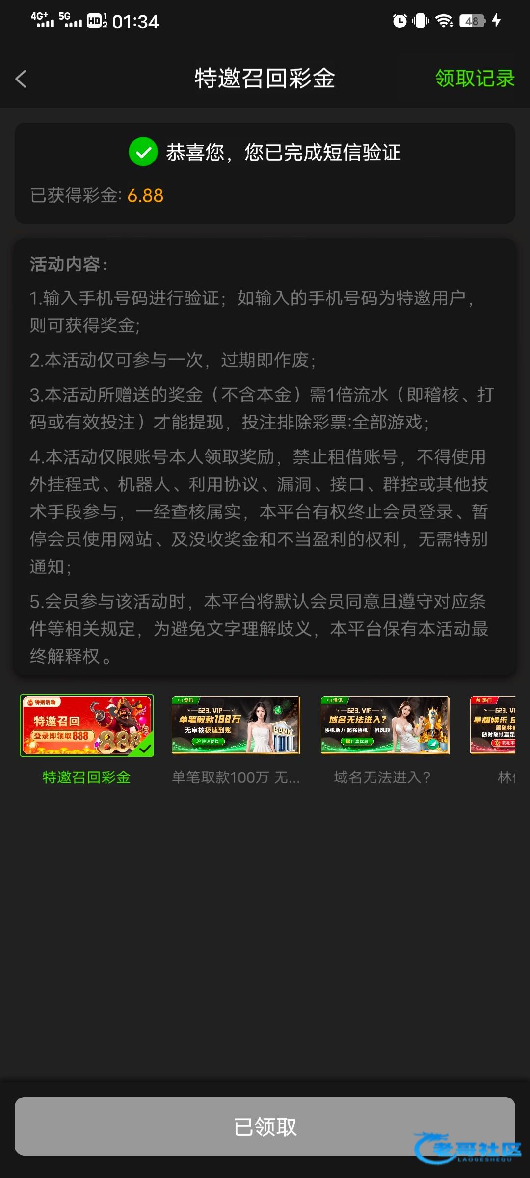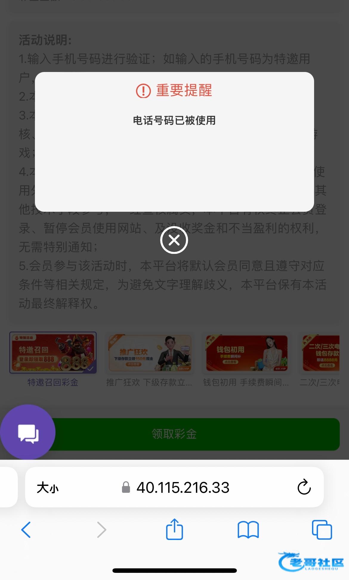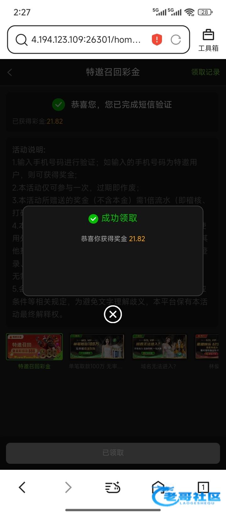老哥推的台子,之前打了个1+1,没打出来,刚才登录上去发现有这个页面,输入手机号就领了。老哥们可以上号看下有没有 xy3544.top