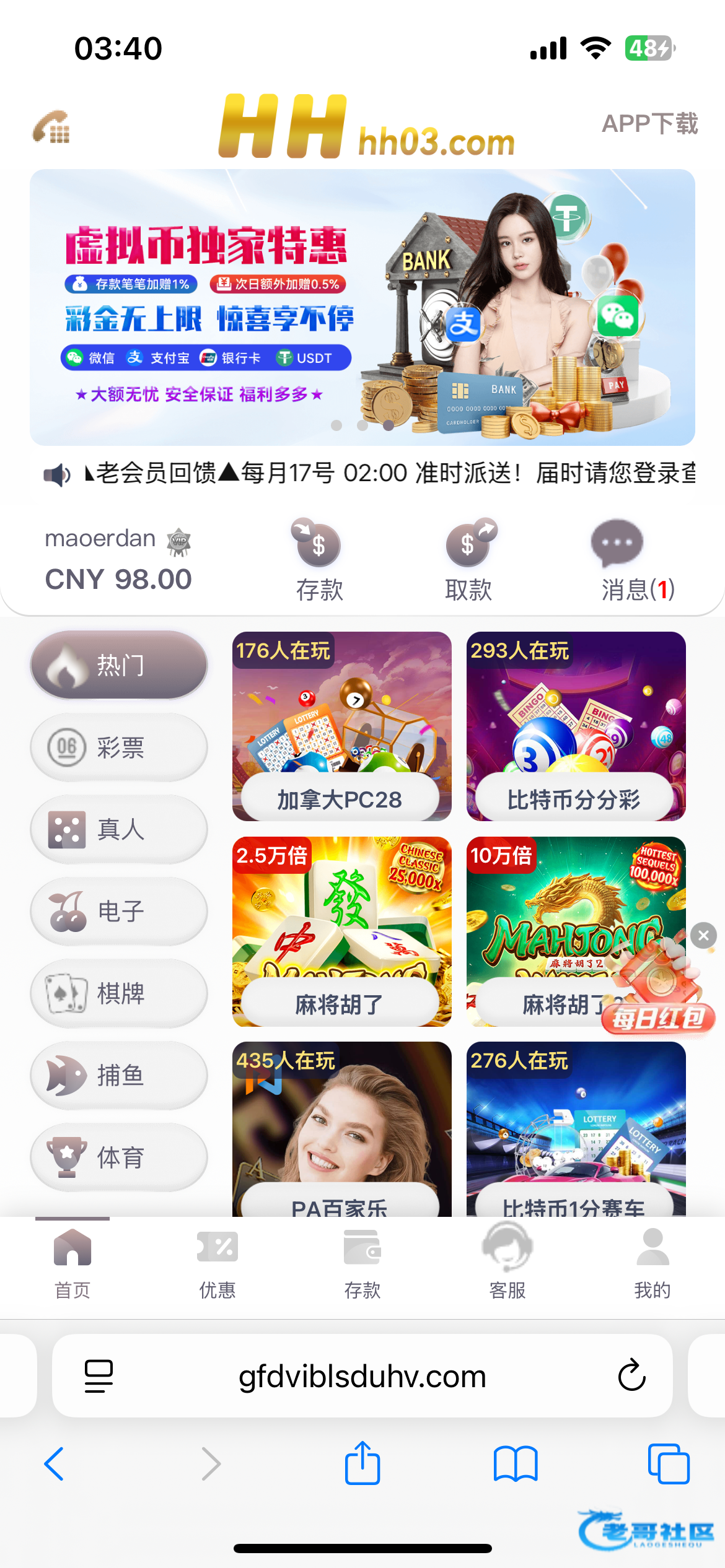 0428.cc 具体自测,这个我有账号微信又加我了,然后显示绑定的手机号不一致,客服让我重新注册然后接验证码领了88。不用找客服,直接优惠里面输入手机号就行,3水没限制我打死了,手机号多的可以试试能不能碰到特邀