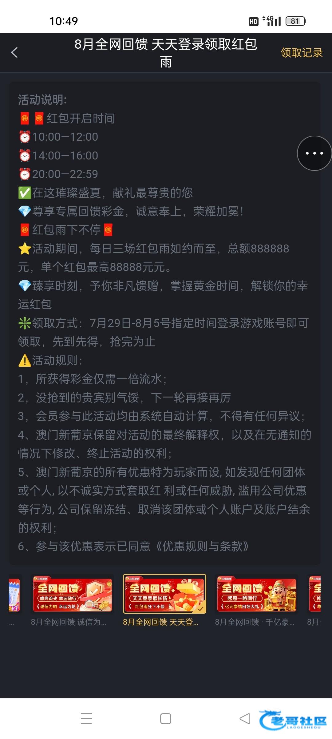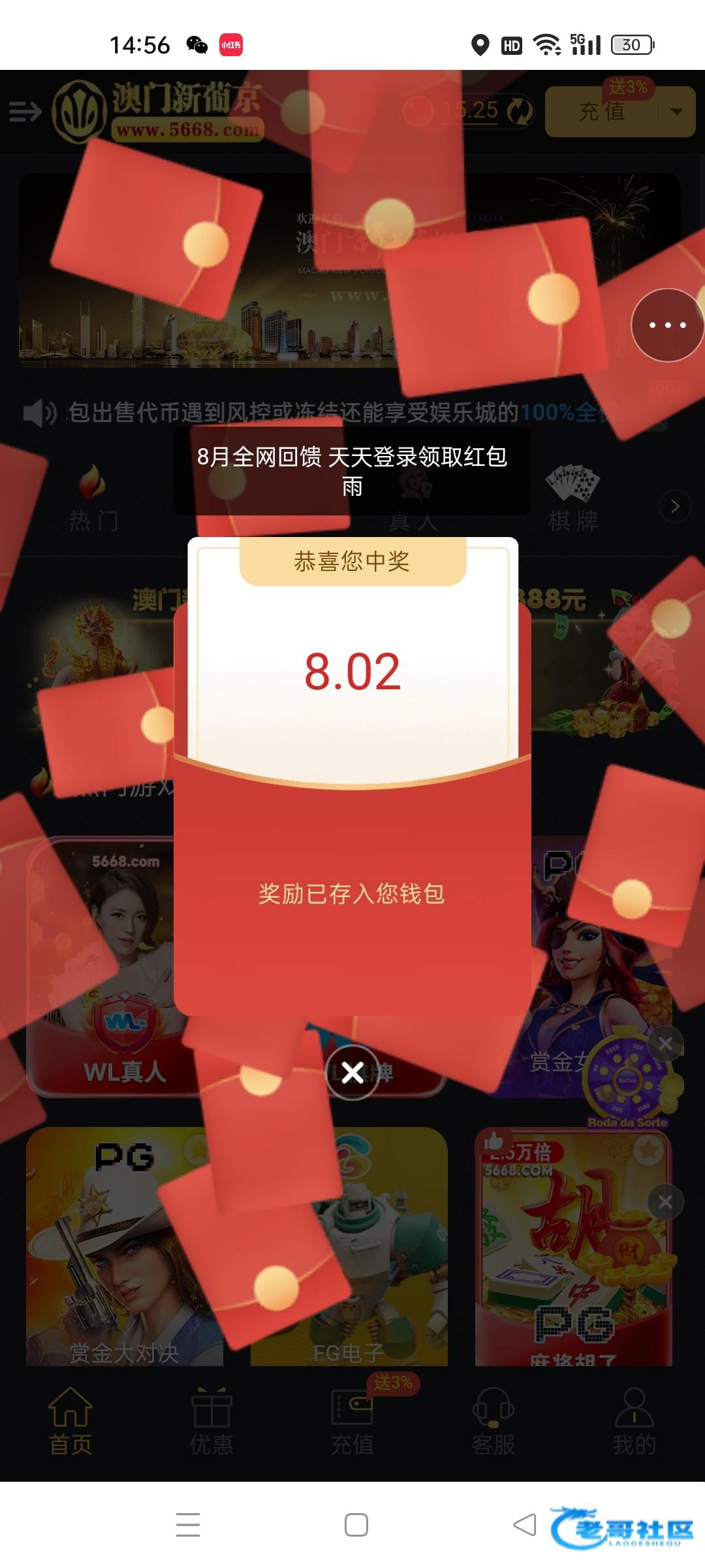 5668.com有历史充值的,8月5号之前,每天三次免费抢红包,三次加起来有20块左右,出款自测。