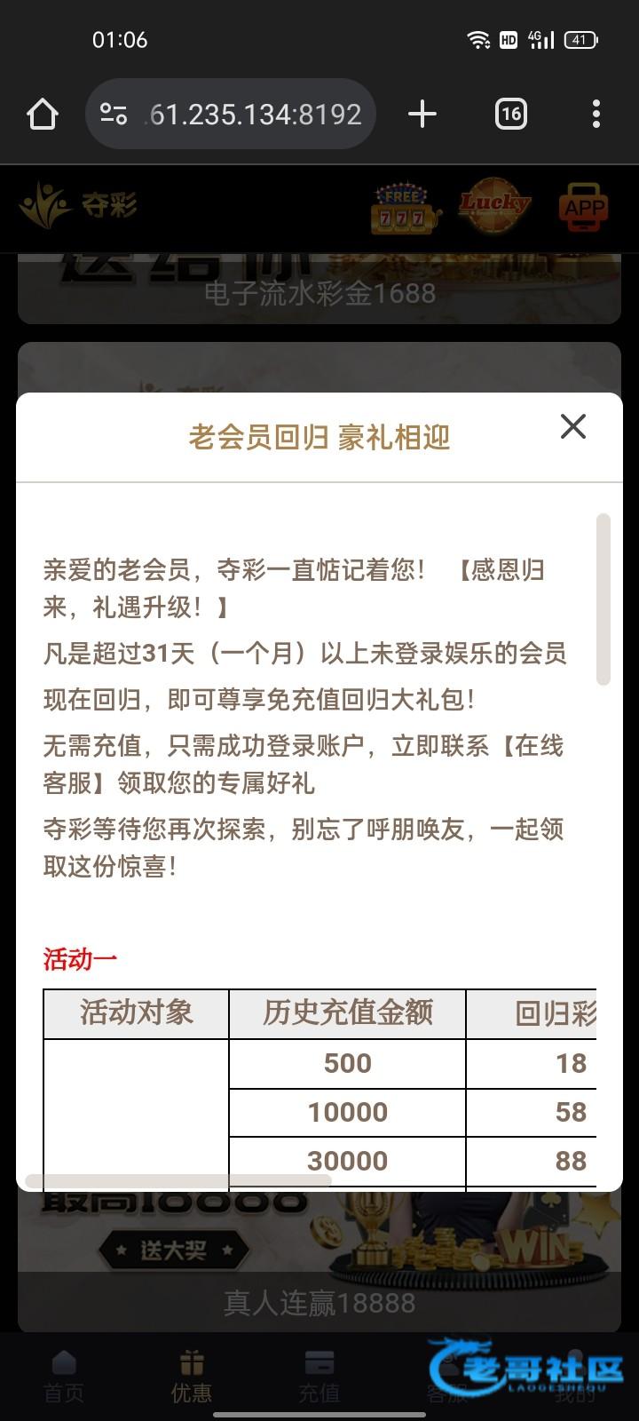 该活动 老会员回归 豪礼相迎 最低历史充值金额为500,故无法为您派发此优惠活动哦,还请您参考下新会员专属三重豪礼 新会员注册200+ 即赠28彩金,存越多送越多哦,谢谢
