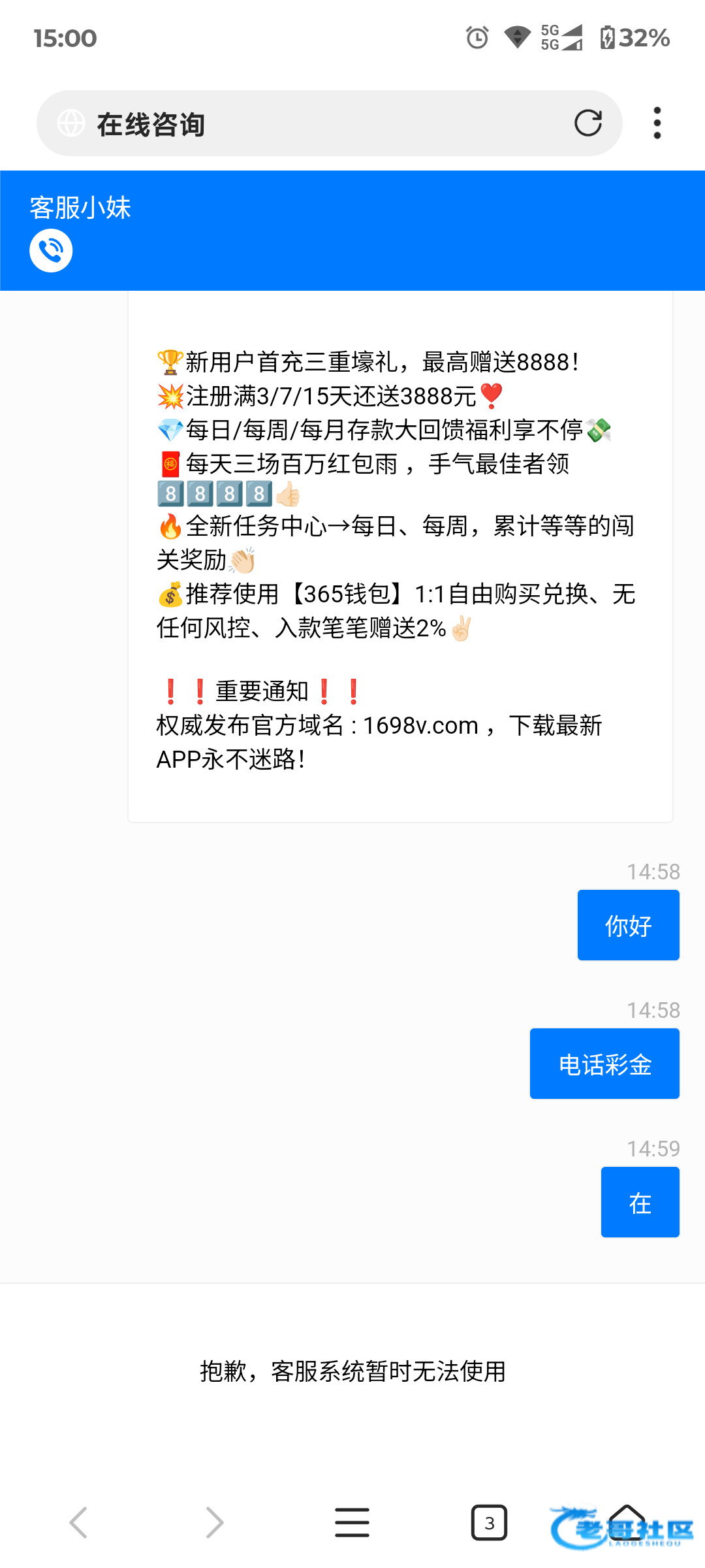 接到电话专员送的,给了88五倍水,我没打出来,不知道黑不黑,查手机号,网址m.vns111111.com