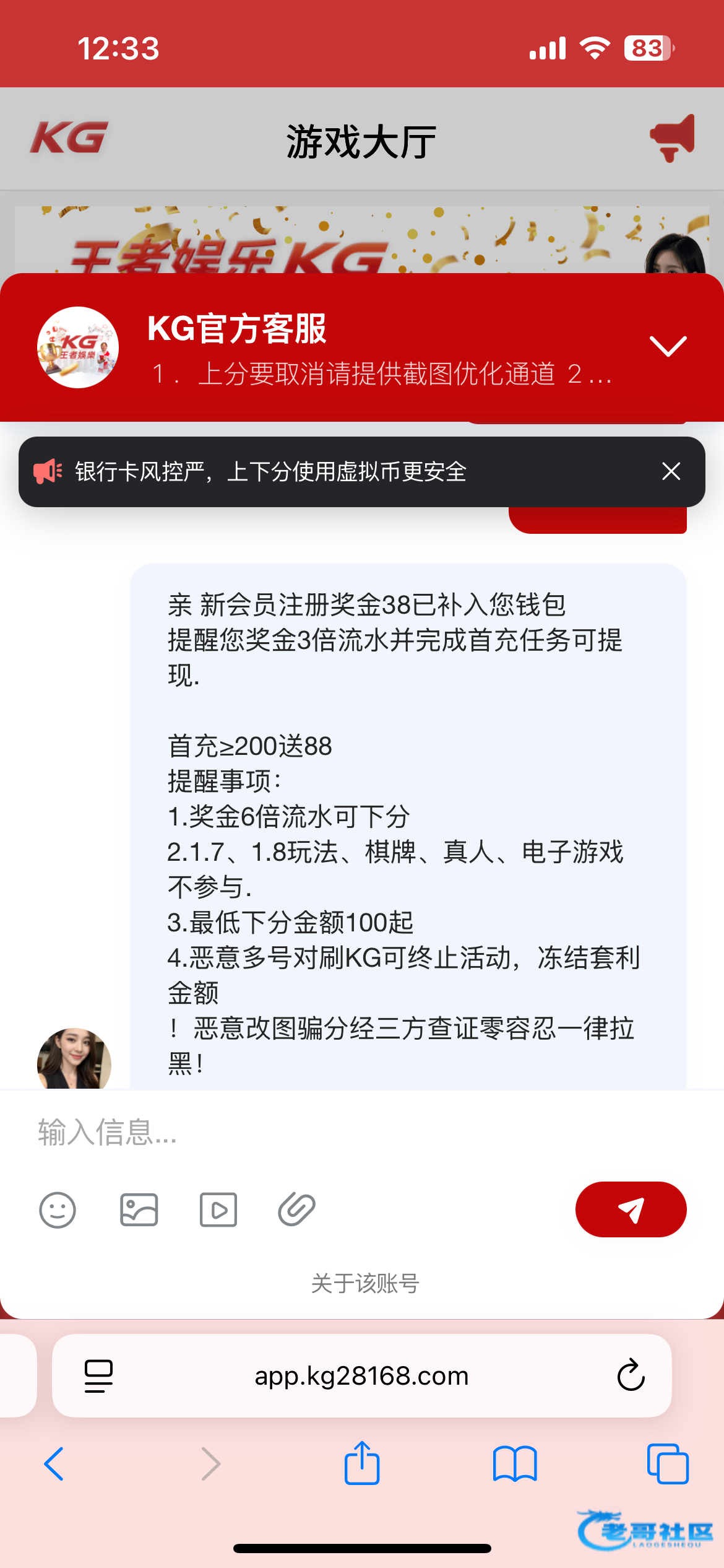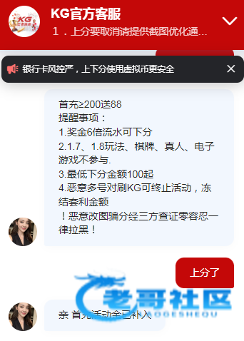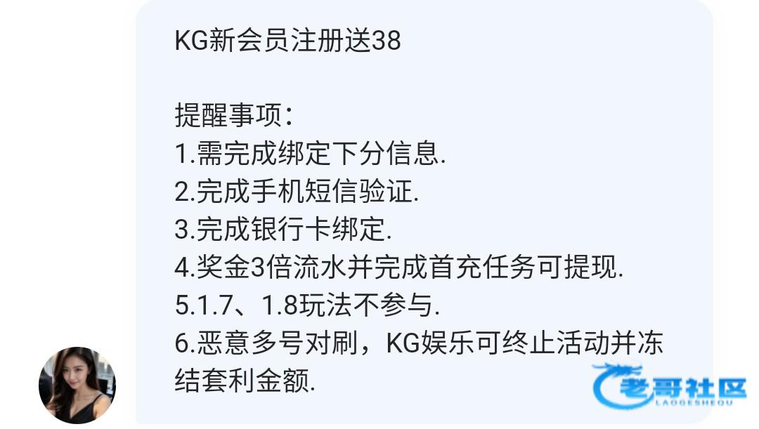 新会员注册送38 首充≥200送88提醒事项:1.需完成绑定下分信息.2.完成手机短信验证.3.完成银行卡绑定.4.奖金3倍流水并完成首充任务可提现.5.1.7、1.8玩法、棋牌、真人、电子游戏不参与.6.恶意多号对刷,KG娱乐可终止活动并冻结套利金额
