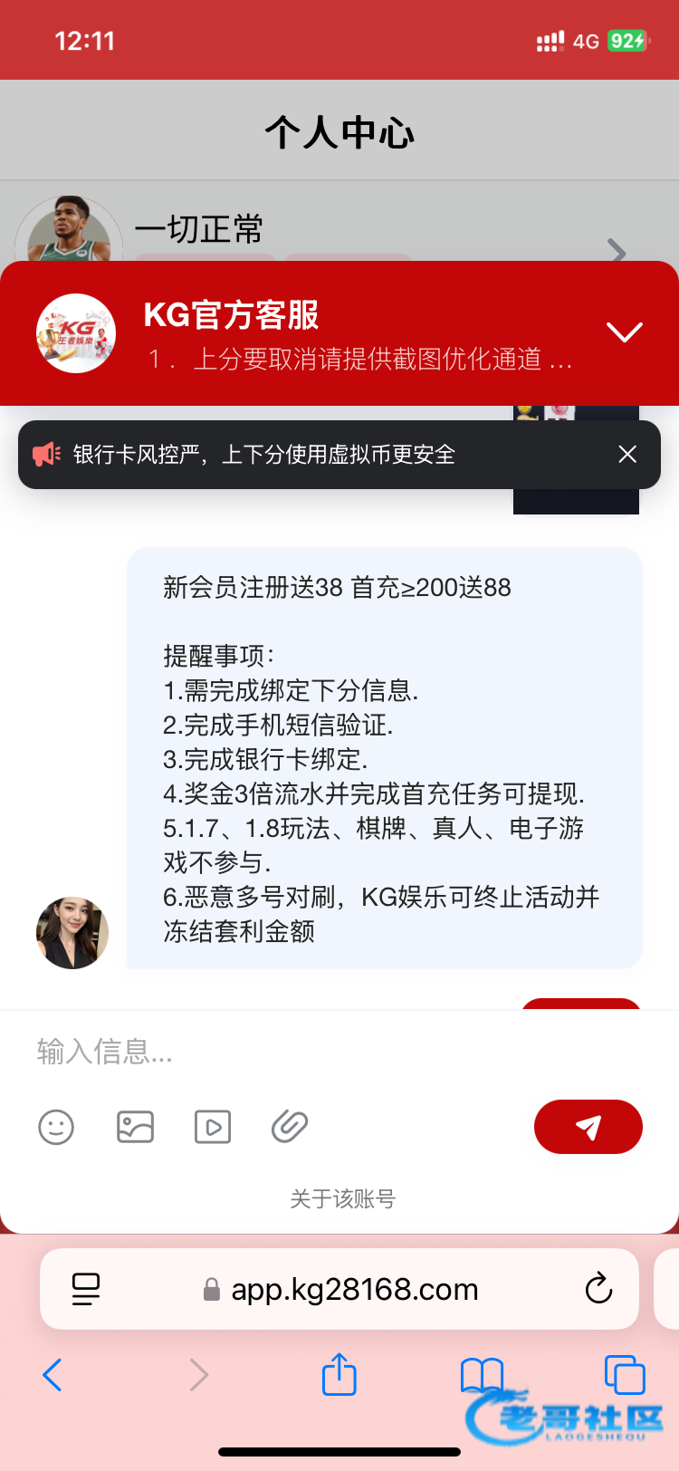 新用户注册绑定找客服领38/100提,规则看图还挺有意思,因为这个活动没有显示的,客服会问哪里知道的,要截图,我就说看片看到的,然后随便找了个免费追剧app,里面一般都有这种链接,就简单p了一下,然后就送了,具体看图,你们最好也是自己找一个简单p一下 不嫌麻烦的可以自己去试试,不试一下怎么知道给不给呢?网址app.kg28168.com