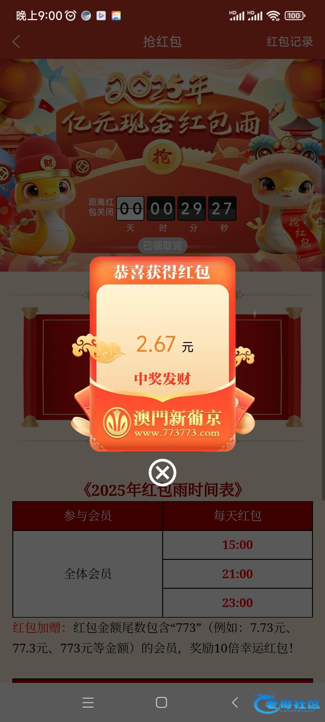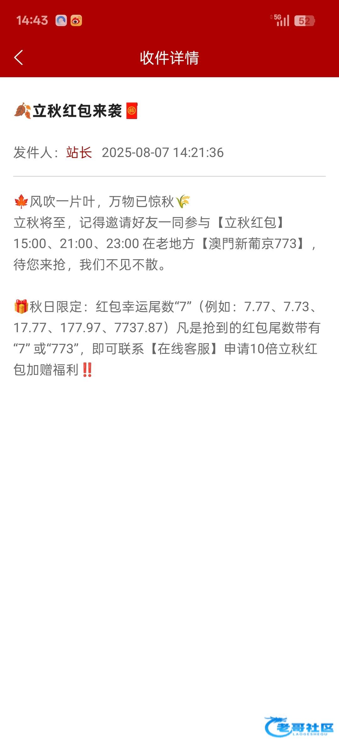 今天773三波红包尾号为7或者773.可以加赠十倍彩金!老哥们别忘记!