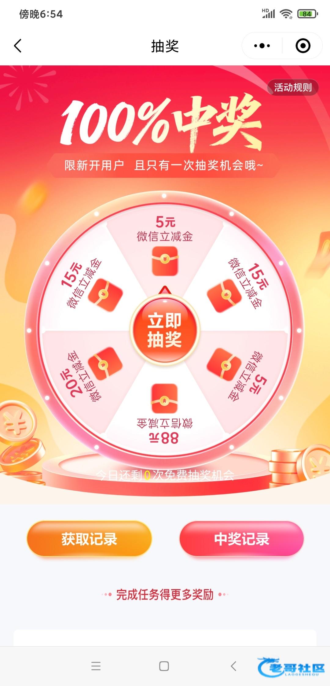 百分百中奖,最低5元亲测,领奖需要在app上领取,在手机自带应用商店上下载即可,然后在app上用你绑的一类卡往你刚开户办的这个苏商二类卡里转1分激活(你注册开户的时候苏商会自动往你绑的一类卡里面转一分钱检测),激活完了再去微信绑这个二类卡支付