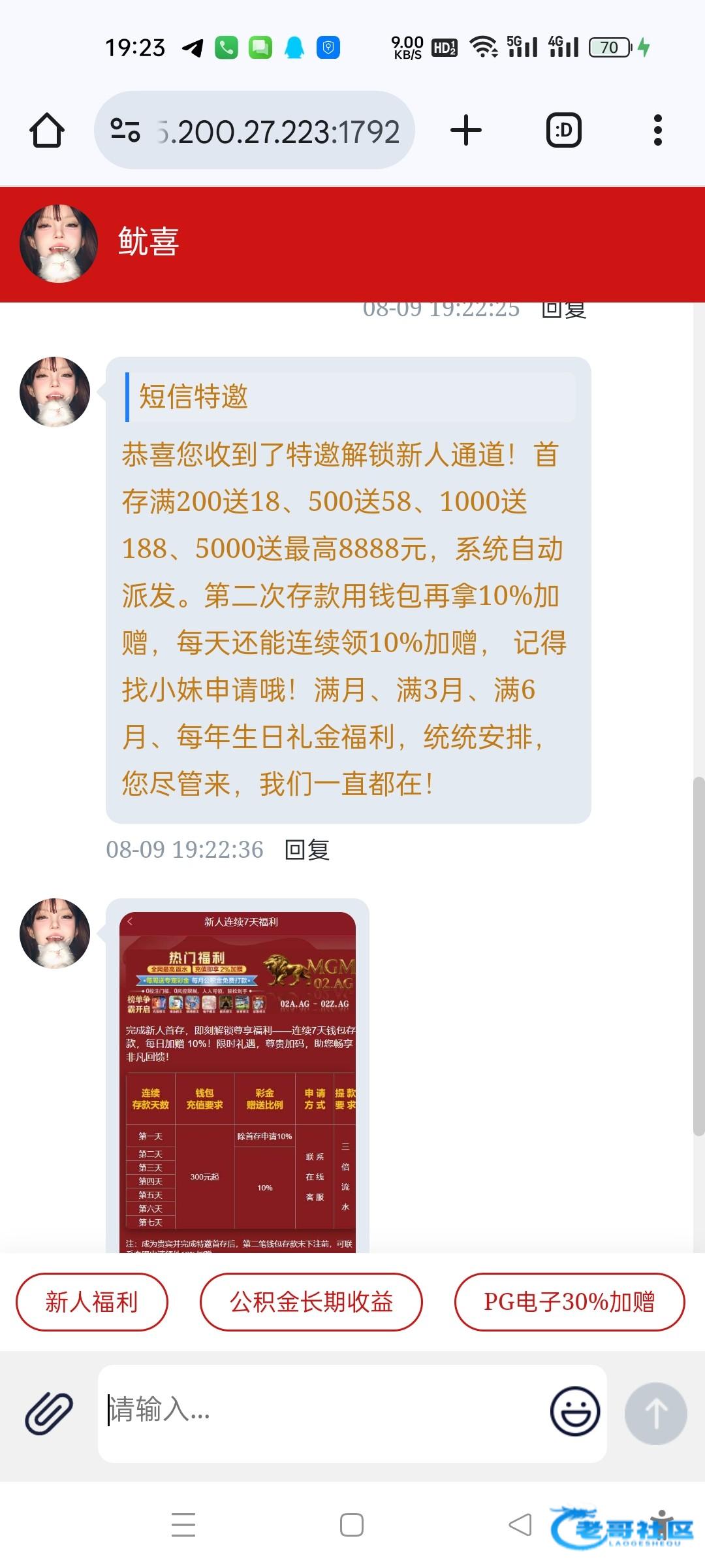 恭喜您收到了特邀解锁新人通道!首存满200送18、500送58、1000送188、5000送最高8888元,系统自动派发。第二次存款用钱包再拿10%加赠,每天还能连续领10%加赠, 记得找小妹申请哦!满月、满3月、满6月、每年生日礼金福利,统统安排,您尽管来,我们一直都在!