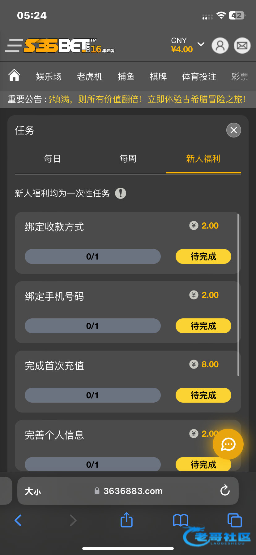 注册-首页横幅-限时福利点进去,新人任务全部完善就OK了,出款自测!网址:https://www.3636883.com/zh-CN/rewards/tasks