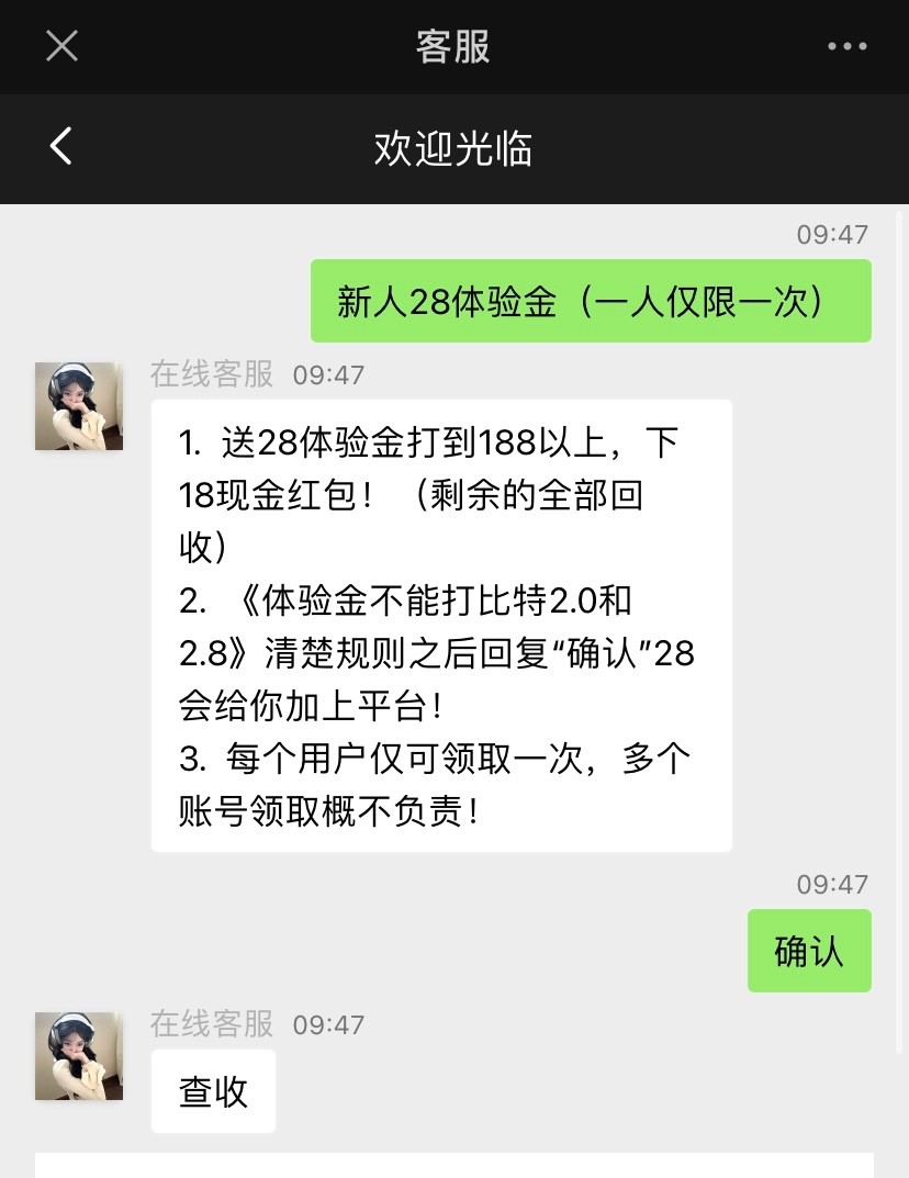 微信登录,在线客服点新人体验金,回复确认领取。28打到188以上,下18现金红包。