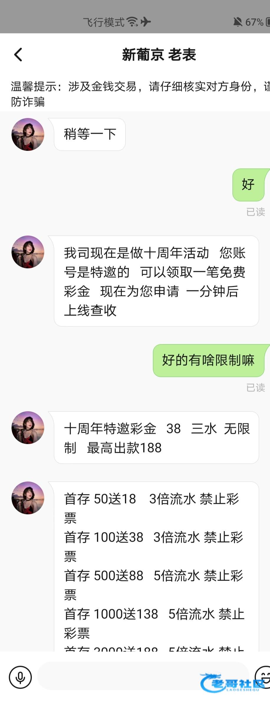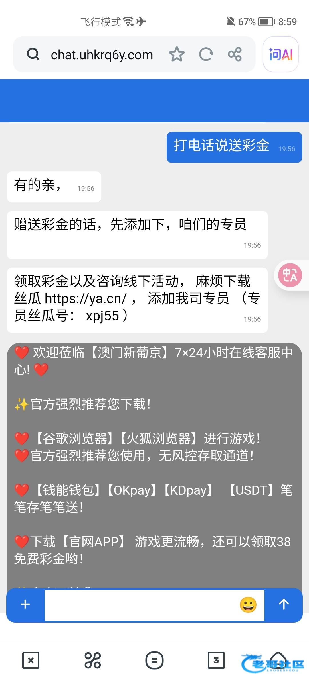 打电话说送彩金 要下载丝瓜加专员 送了38联系方式看图 我这没查手机号就送了 可以去碰瓷一下试试 平台网址80078.vip我没打出来 黑不黑自测 不要充值