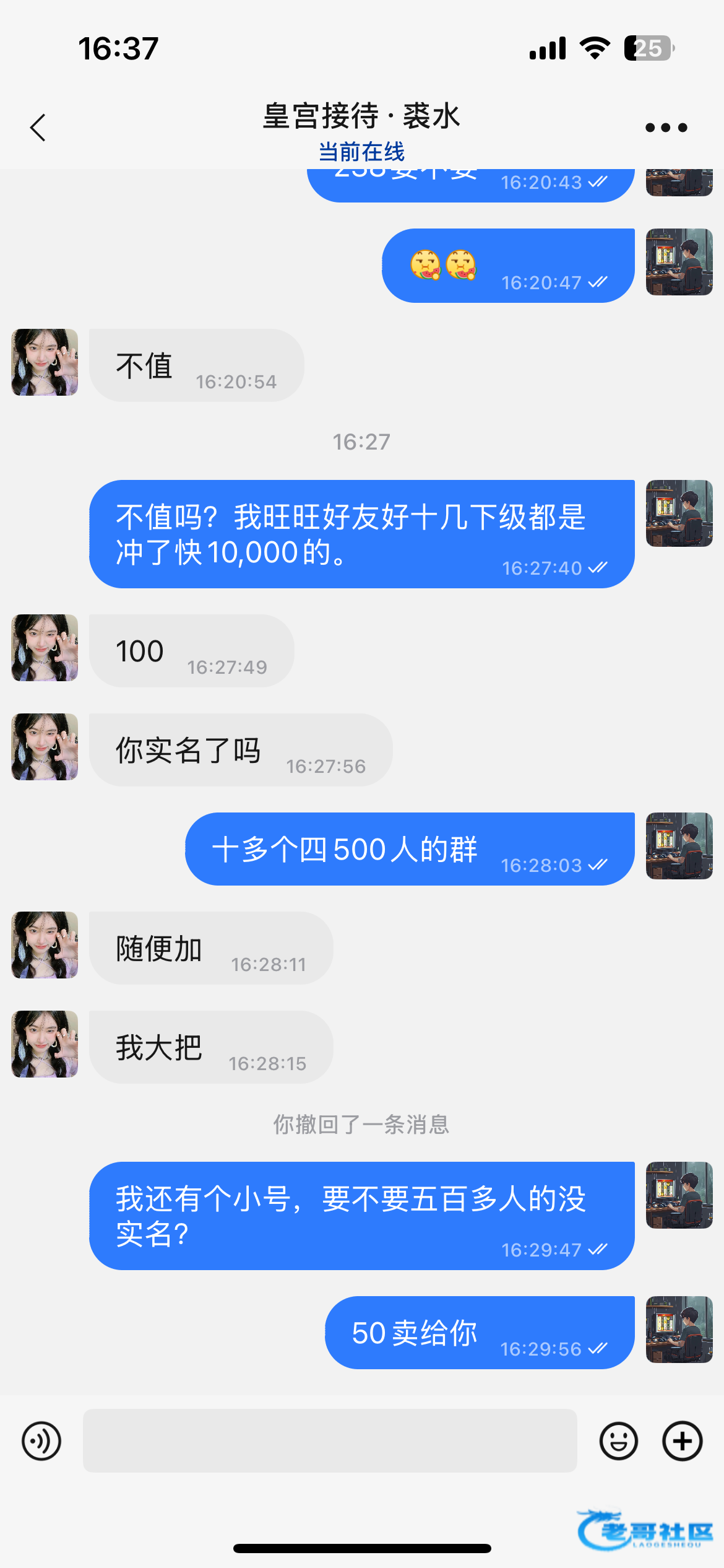 有个老哥不是发帖说皇宫注册送38吗?我就去加旺旺了,结果不送我就逗他,录个视频给他,他看到我有1800个好友,十几个四百多人的管理群,叫我把我旺旺号卖给他,笑死我了