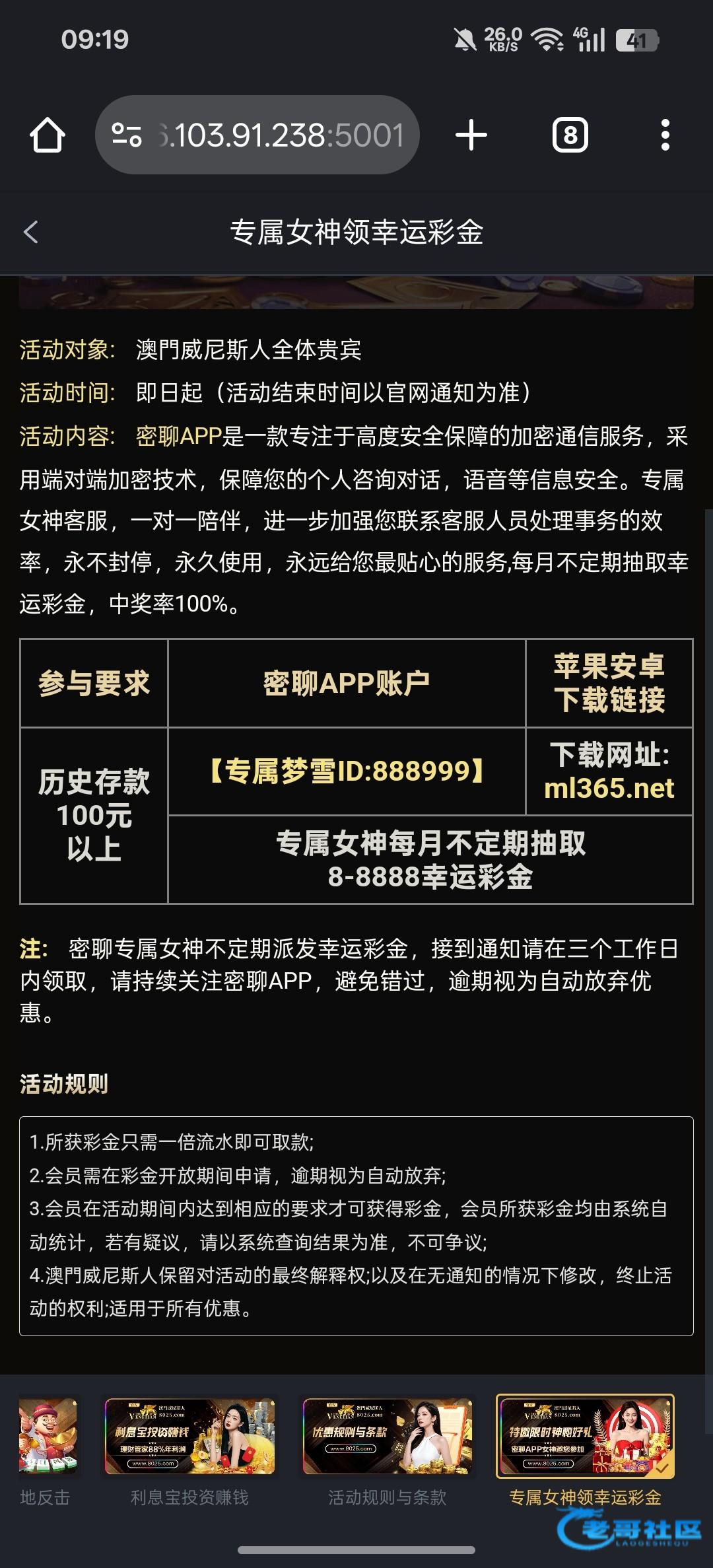 兄弟们快点去密聊看看有没有客服发私信,好几个台子都发幸运金了,领到了去拉光头跟赏金,有水!!!目前8025跟1959我都领到了28跟38,两个台子一共吃到了5张8025.com