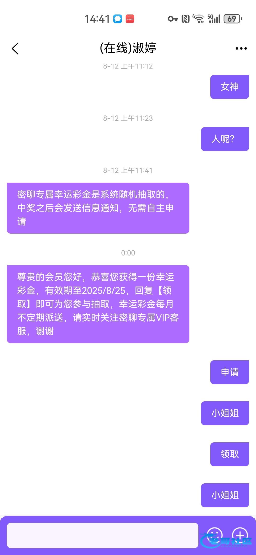 发帖的目的是为了提醒一下有下载过密聊的老哥们的,我之前就是没注意错过了几笔密聊彩金,至于台子我也说了很多台子都有密聊客服的,有些没脑子的老哥就开始骂人了,这种人就该他输钱